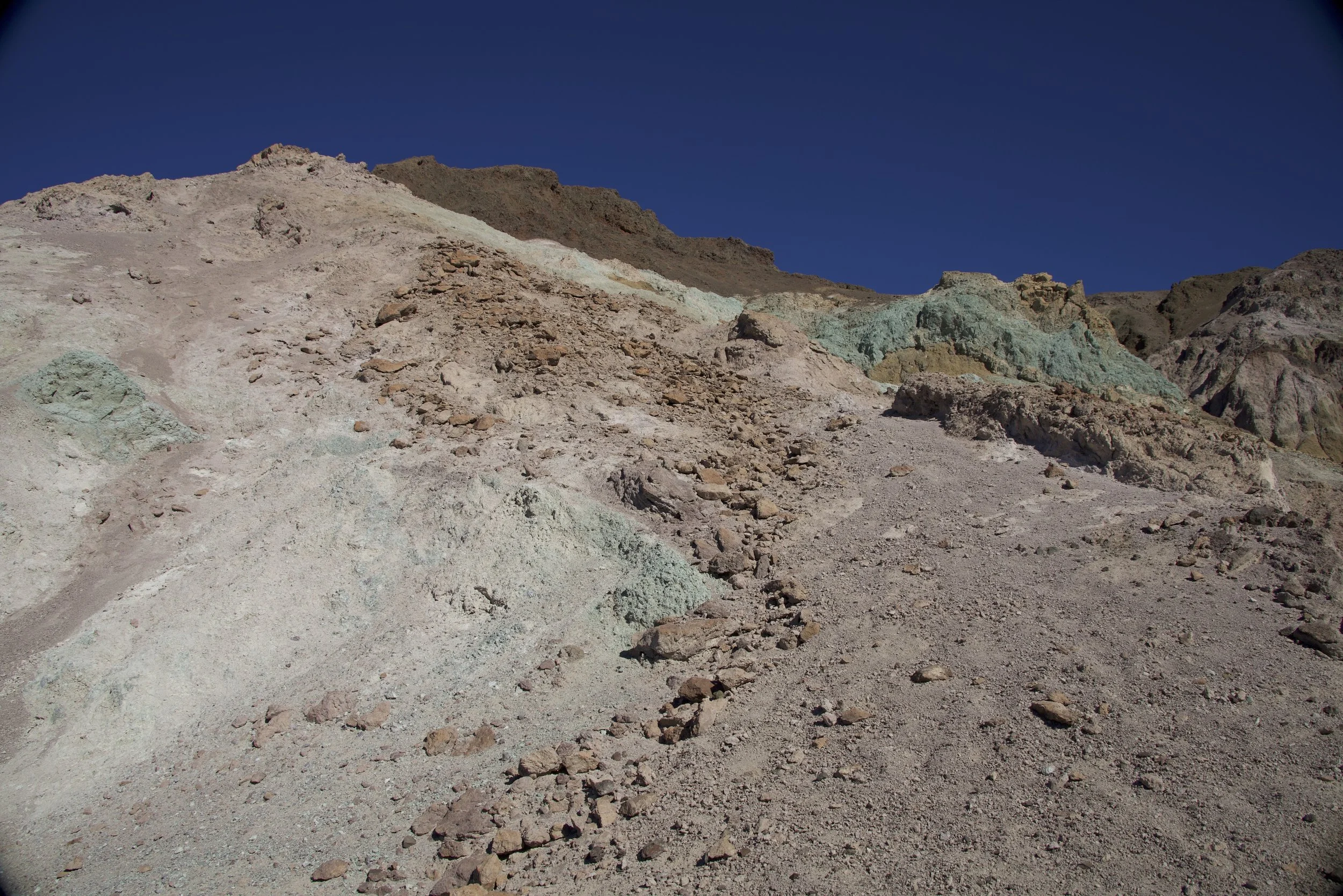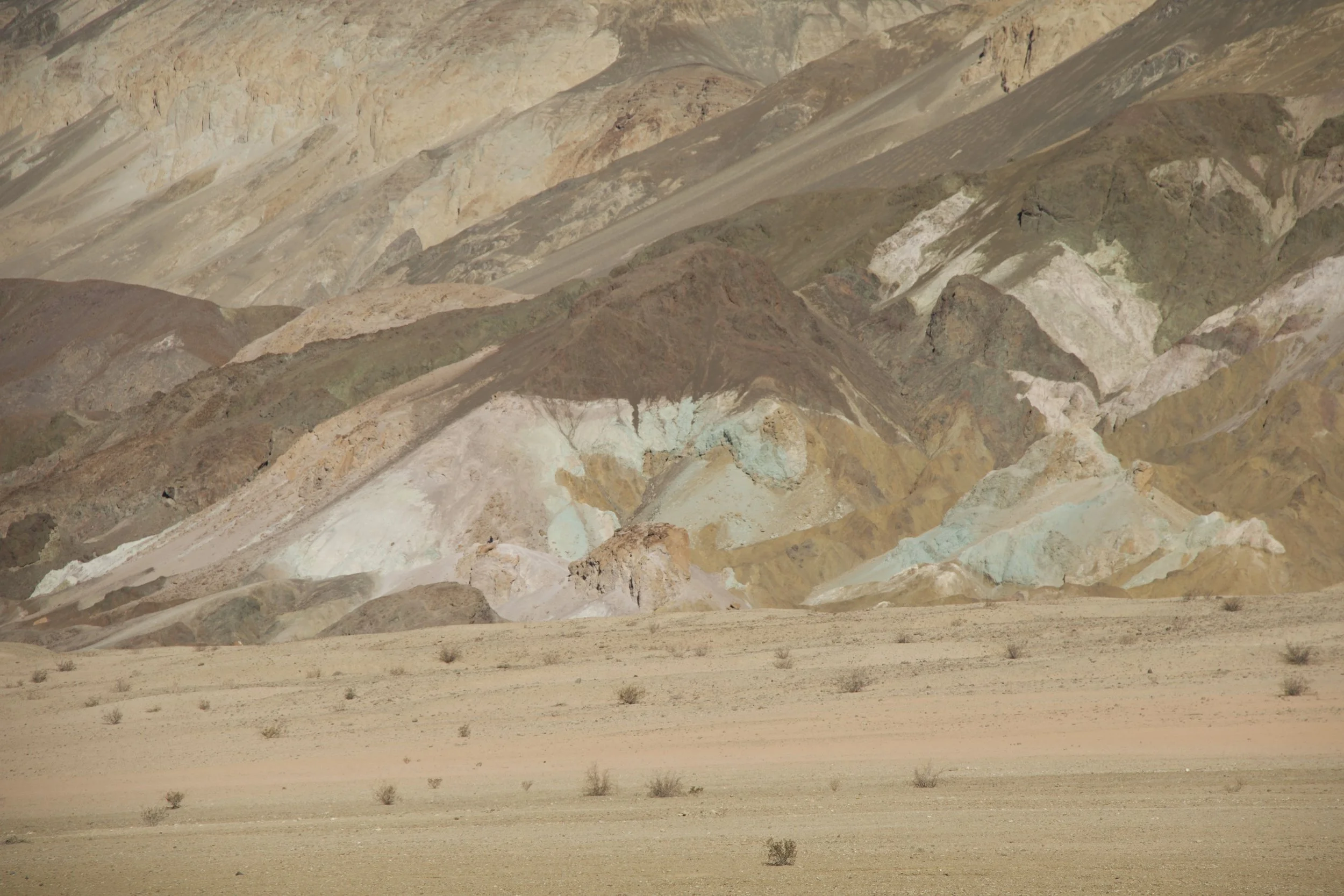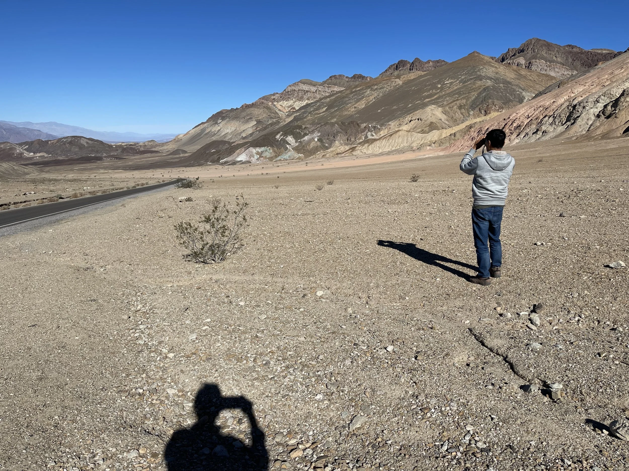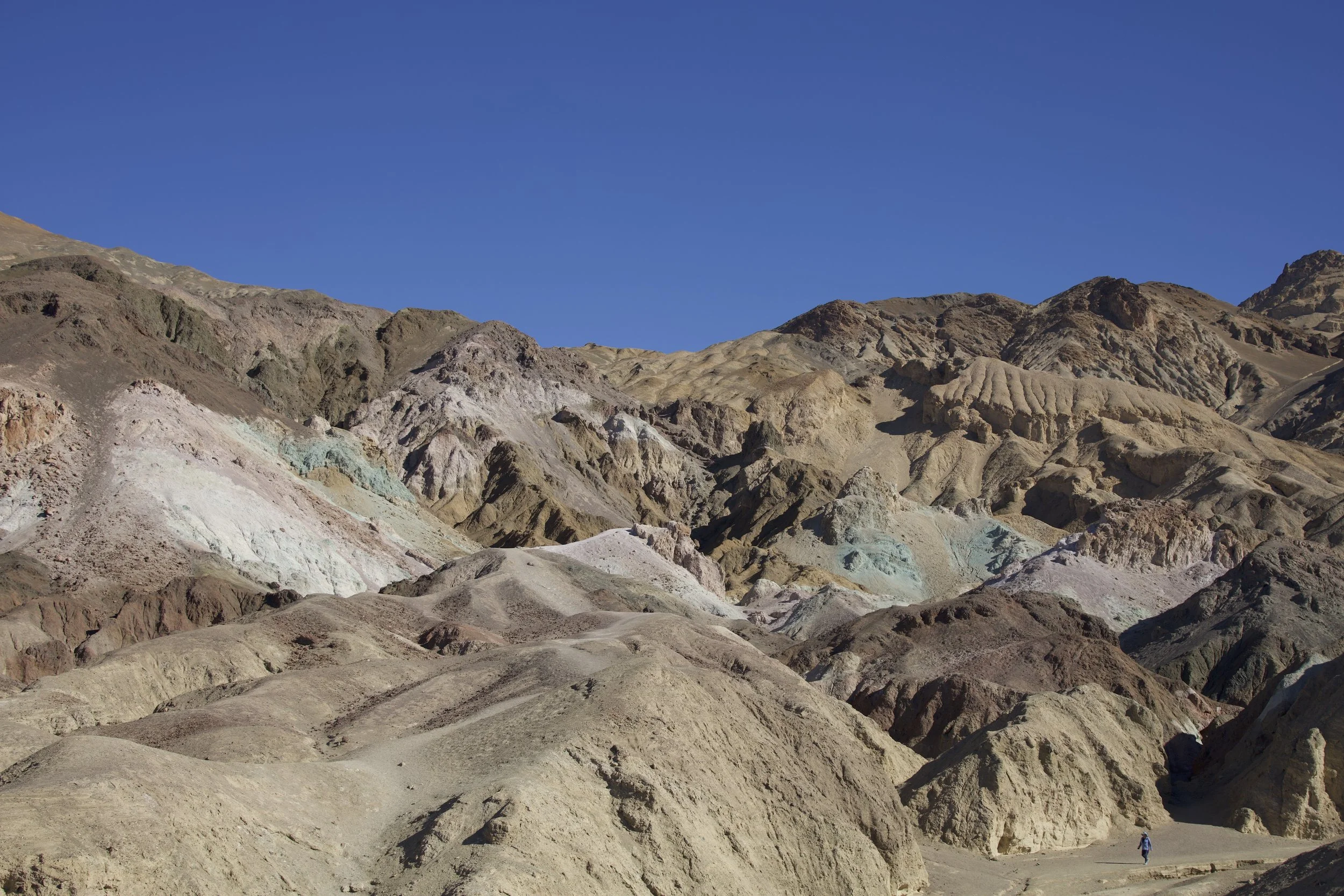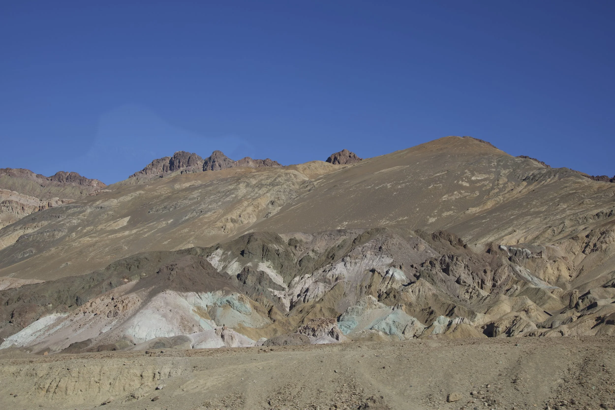 N. now knew better than to exclaim “the worst national park…” prematurely. And our introduction to Death Valley by the scenic drive through Artists Palette (9.7 miles) quickly established the specialness of this park. No singular, uniform colors for these mountains and hills; here, only multi-hued, kaleidoscopic colors would do: beiges, golds, browns, greens, pinks, red, sometimes all in one mountainside. “Artists Palette” is not a bad name, but I called it “Rainbow Sherbet” in my head; they looked like gigantic mounds of half-melted ice cream in all kinds of flavors: chocolate, strawberry, pistachio, vanilla, Neopolitan. Although we had planned for a quick drive, it was impossible to not linger.