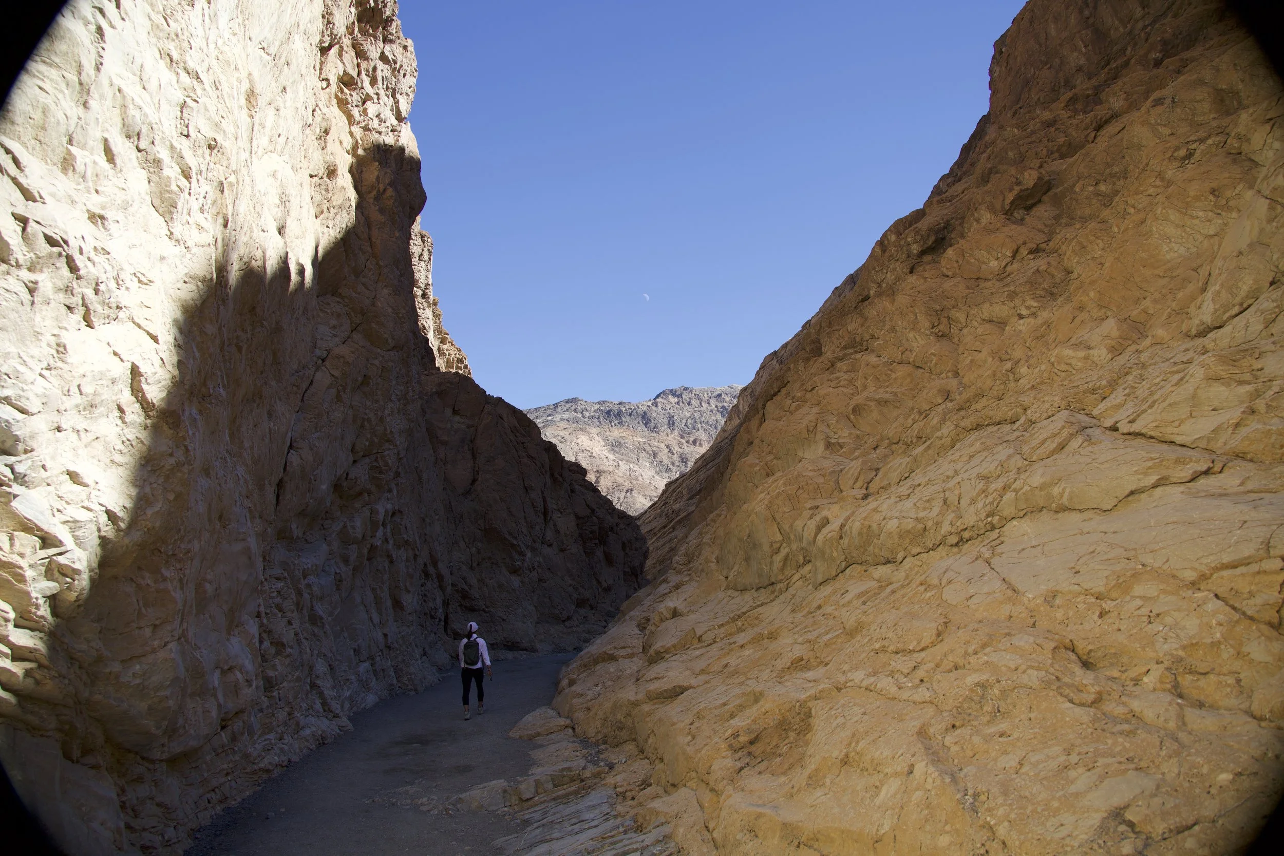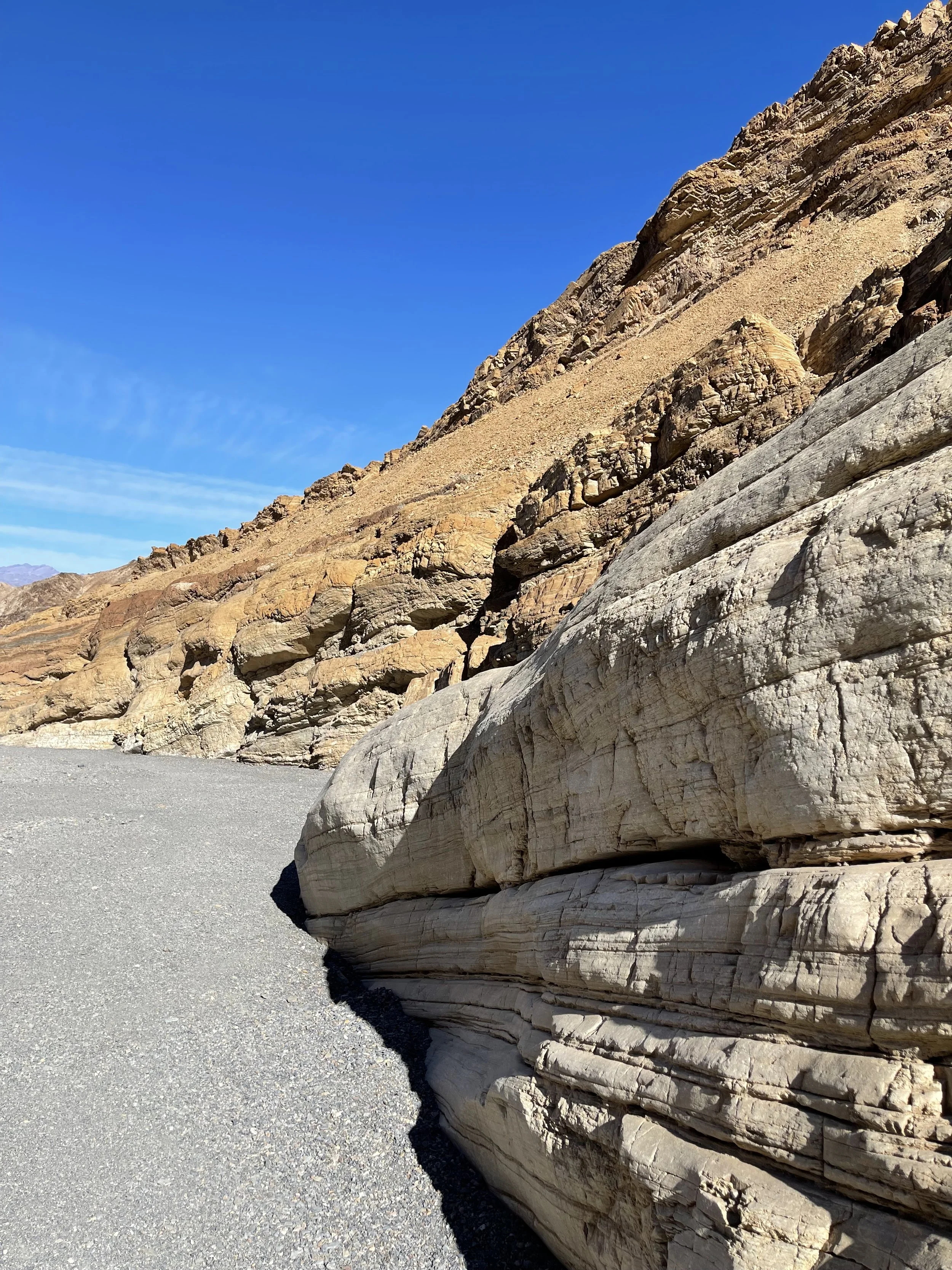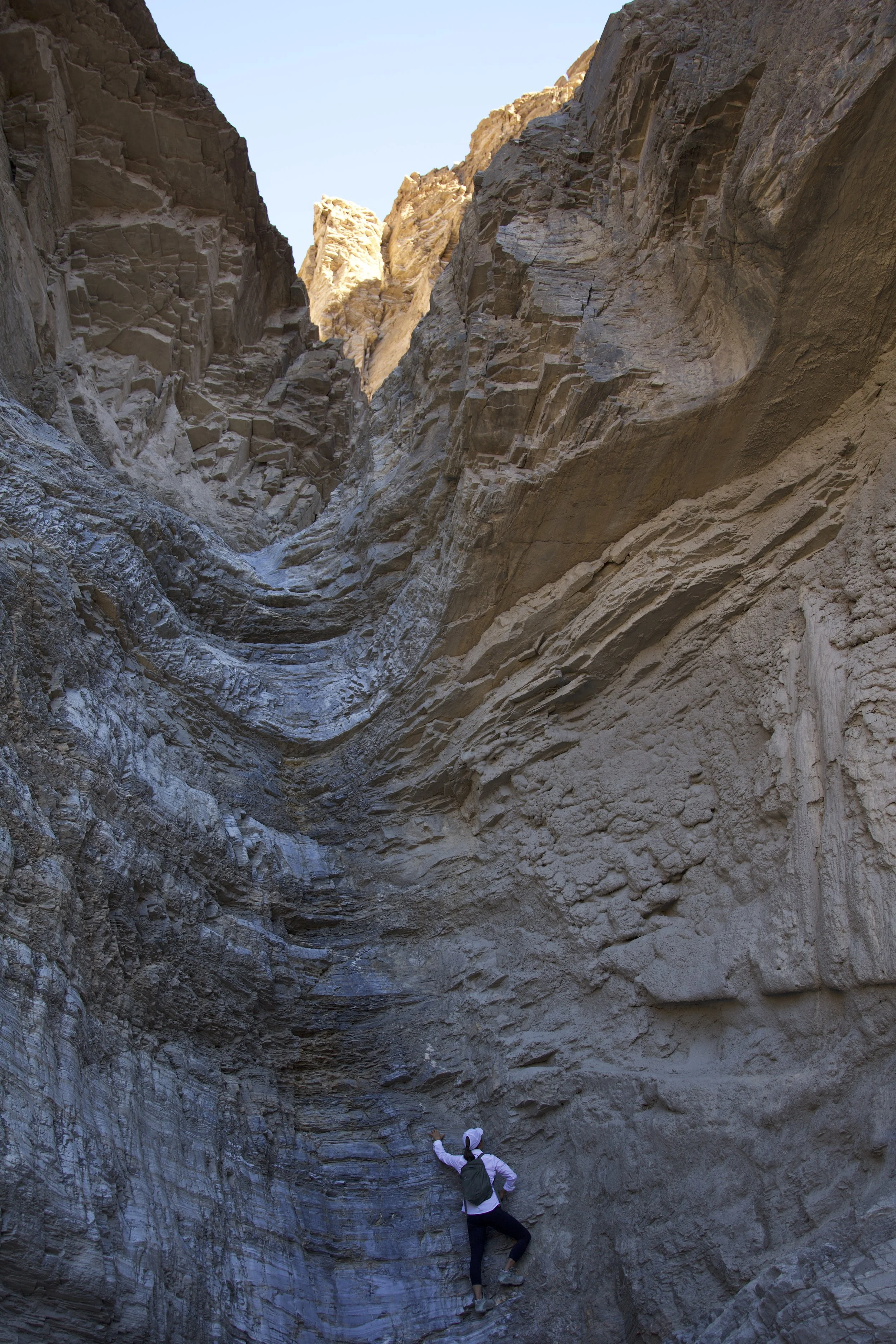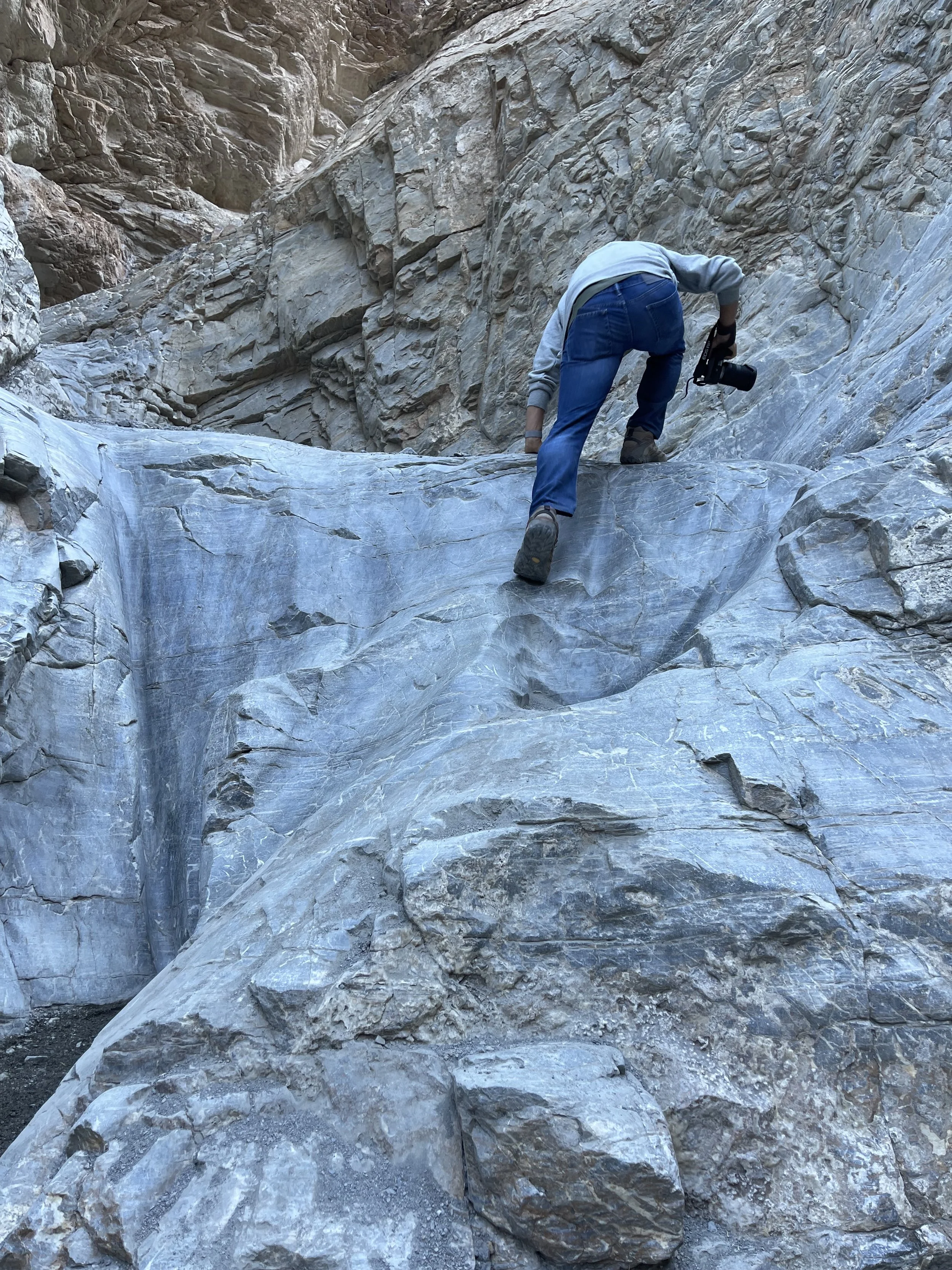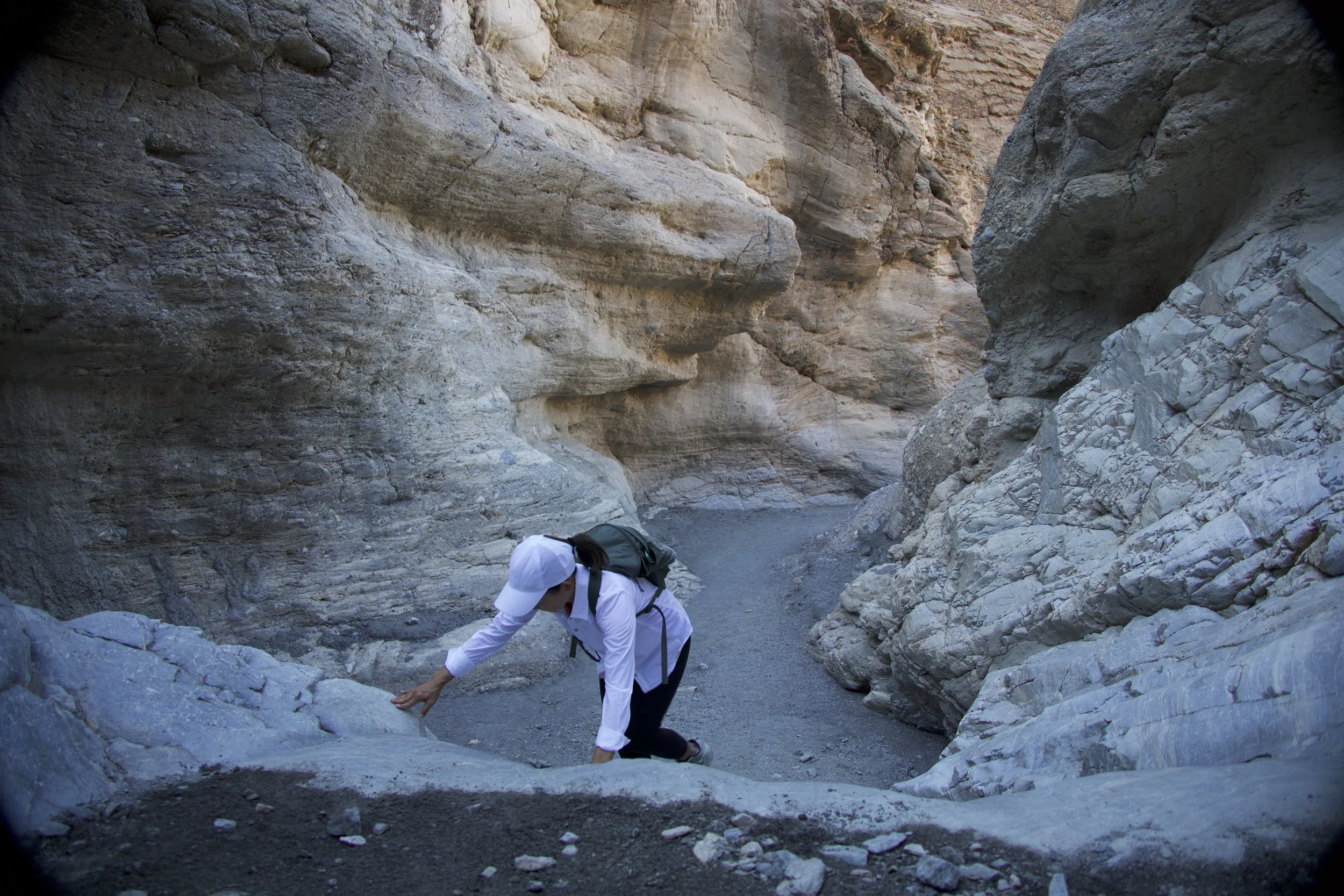 It’s hard to think of rocks as “living things” but a hike through the canyon easily proved the point. We could see gigantic boulders which had obviously broken off from ledges above, filling the canyon, which then got washed out by subsequent rains and floods. Wash-rinse-repeat, and the process filled and re-filled, carved and re-carved the canyon. Hiking this trail was fun because of a good number of rock scramblings required, which had the effect of making me feel playful and carefree… in Death Valley!