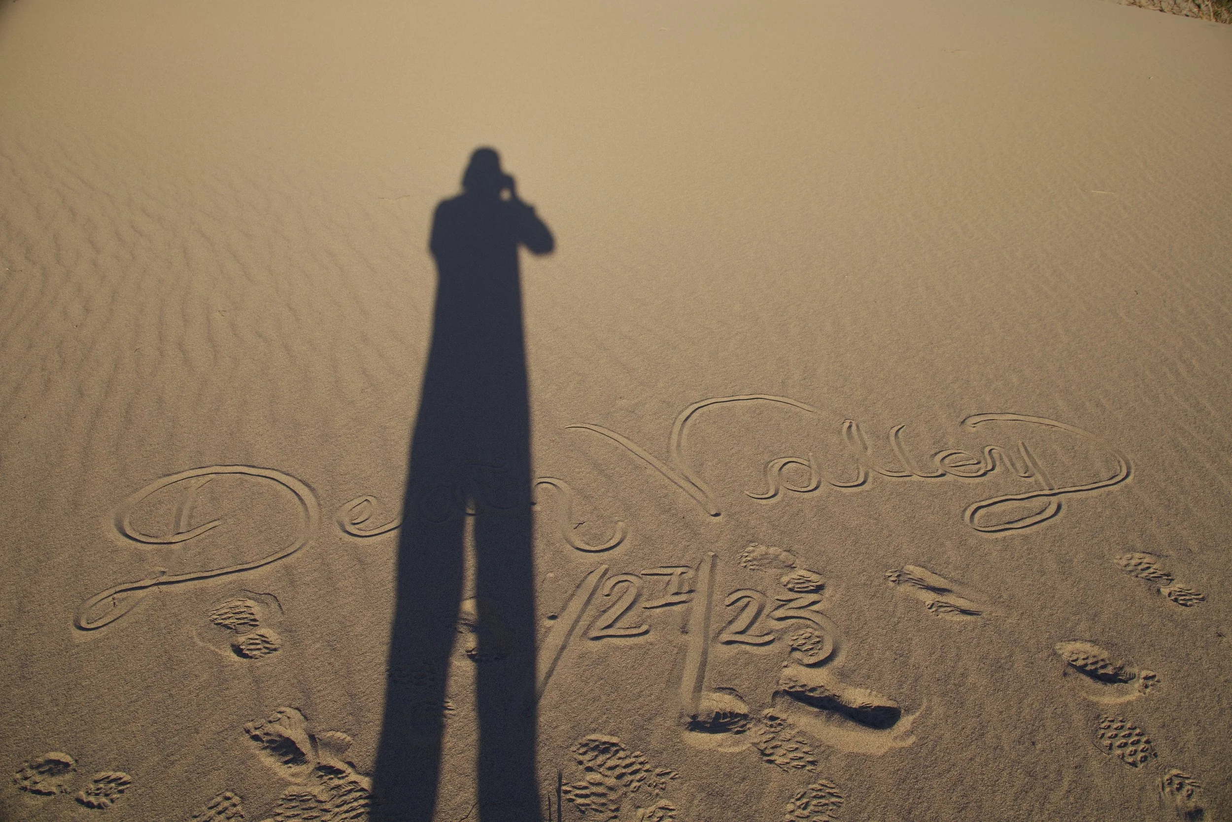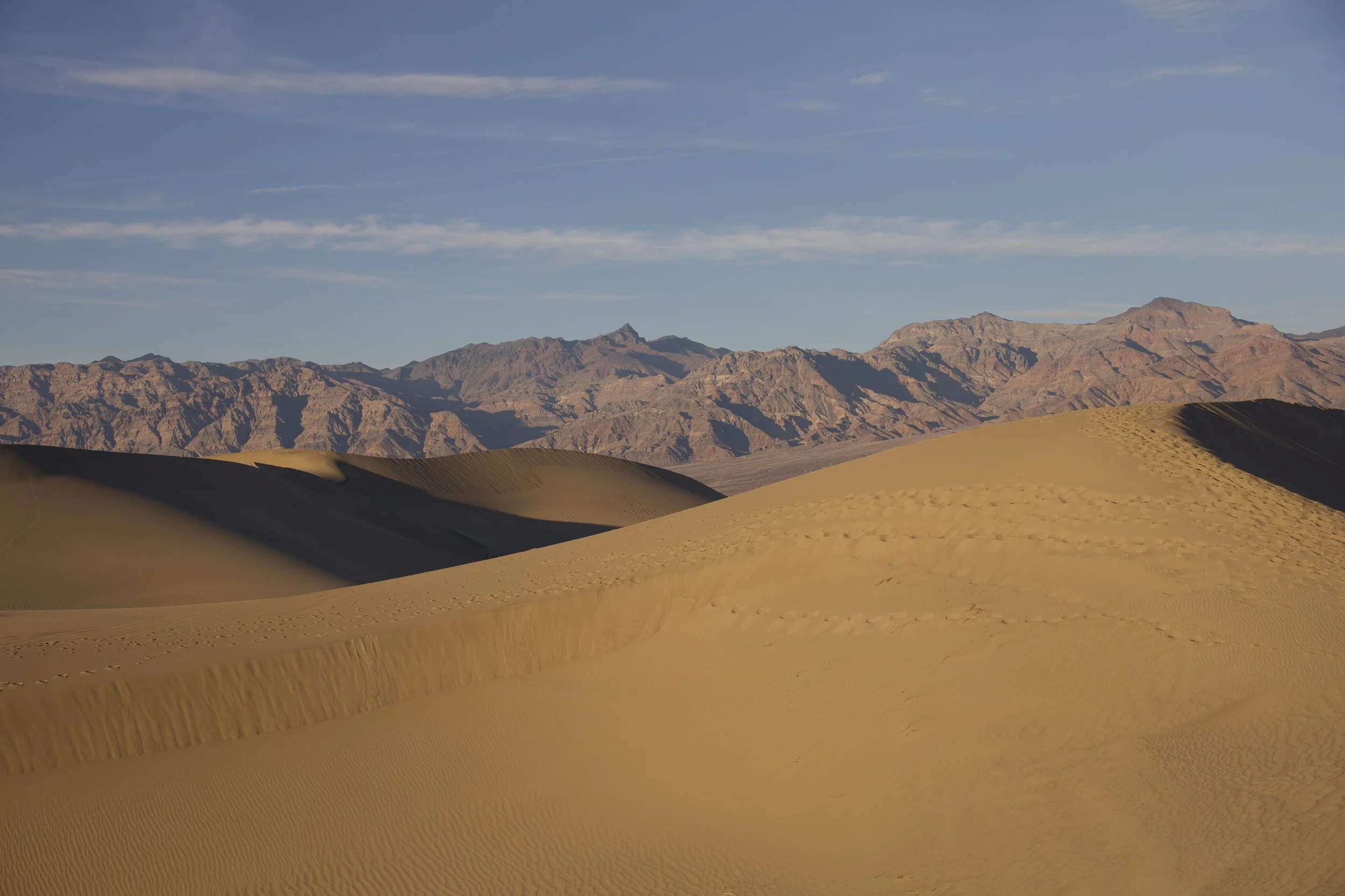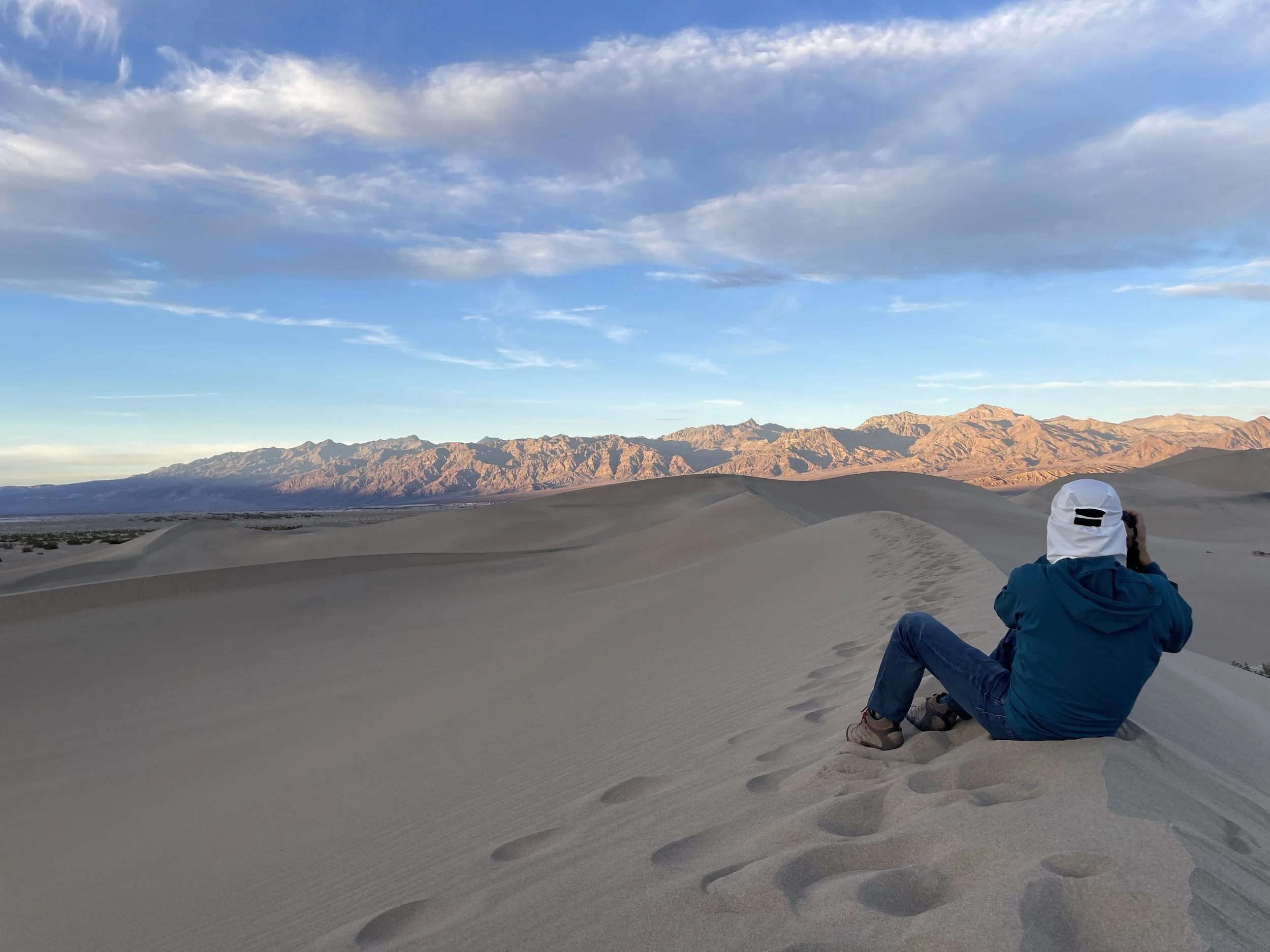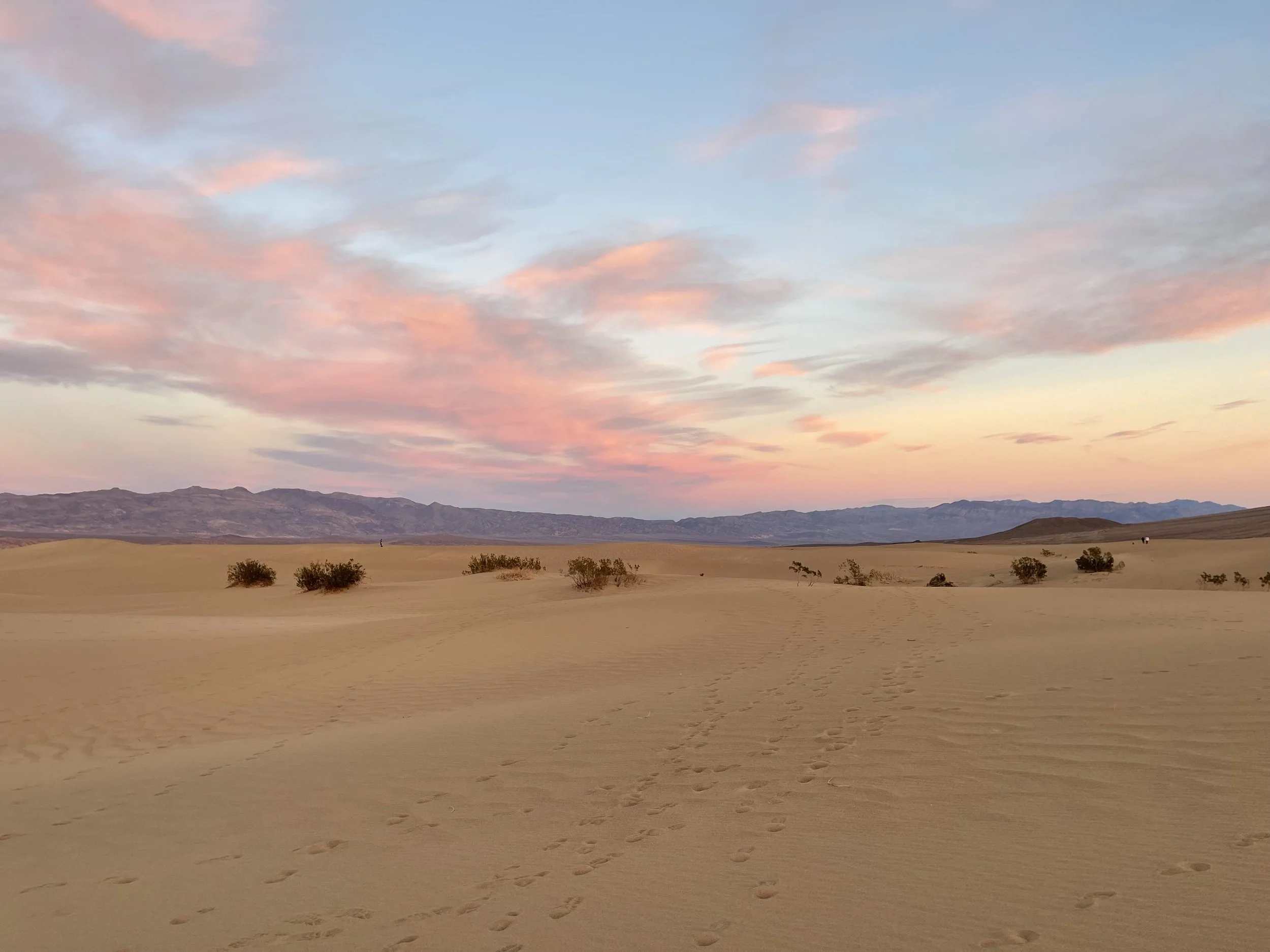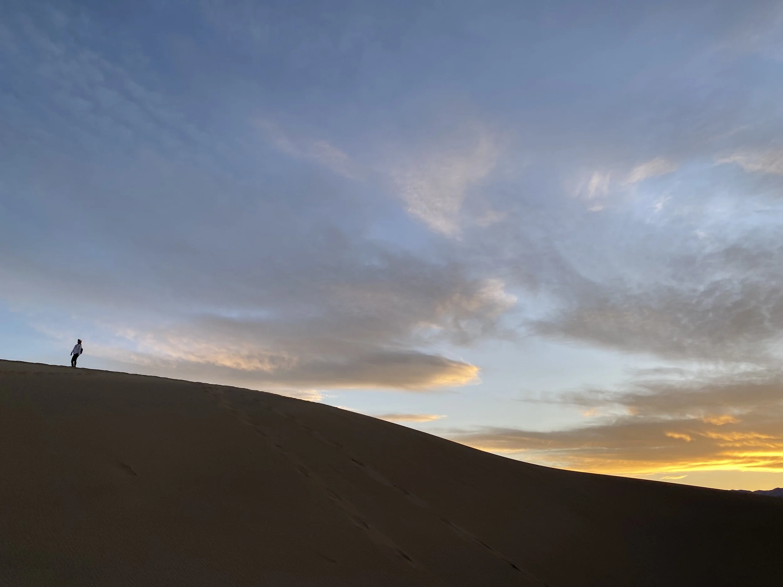 Last item in the schedule: a ranger-led Mesquite Dune Sunset Hike. Ranger Kate did a fine job, but N. and I were comparing these dunes to those at White Sands National Park, so we were a bit underwhelmed. These tawny-colored dunes were fine, but it felt different to see so many people around us. It was hard not to think of the whole thing as a very large litter box: we saw a discarded face mask, lots of pistachio shells, and footsteps in every direction. N. and I were hiking so diligently to get away from other people that we actually reached the other side of the dunes.