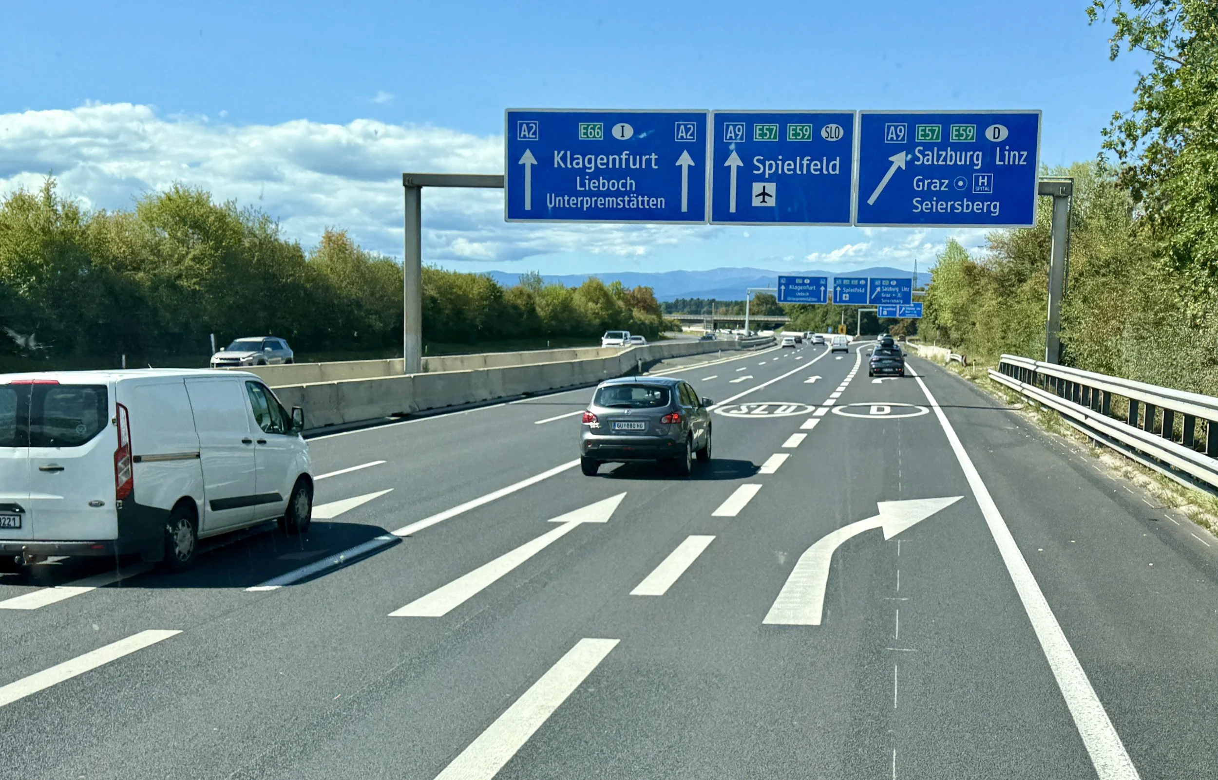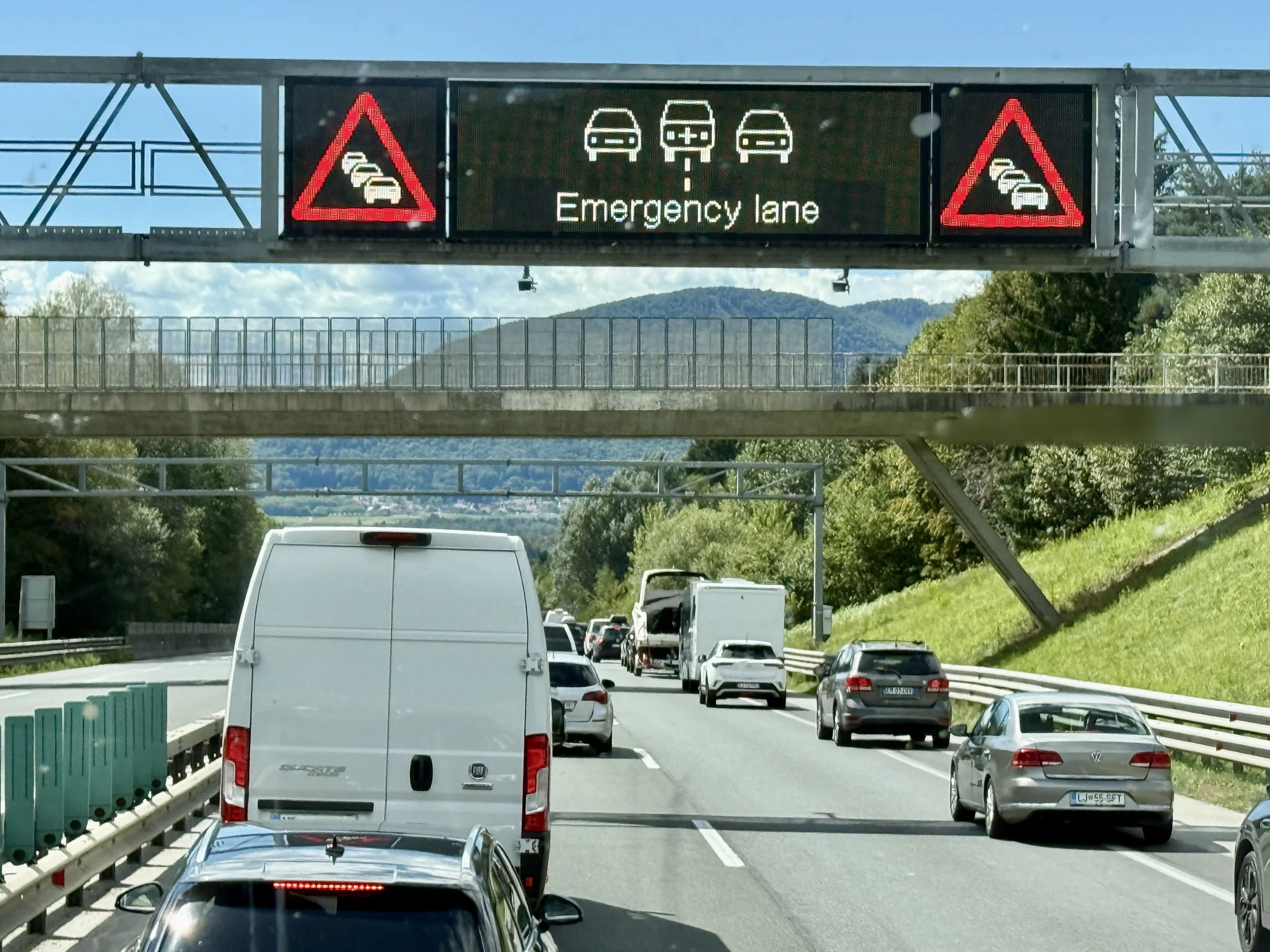 Neither were there “Welcome to Slovenia” signs. We quickly noticed that Slovenian road signs listed names and distances with the farthest destination placed at the top of the list, with the closest at the bottom. Weird. The country also loved LED traffic signs and had more tunnels that broke through the mountains.