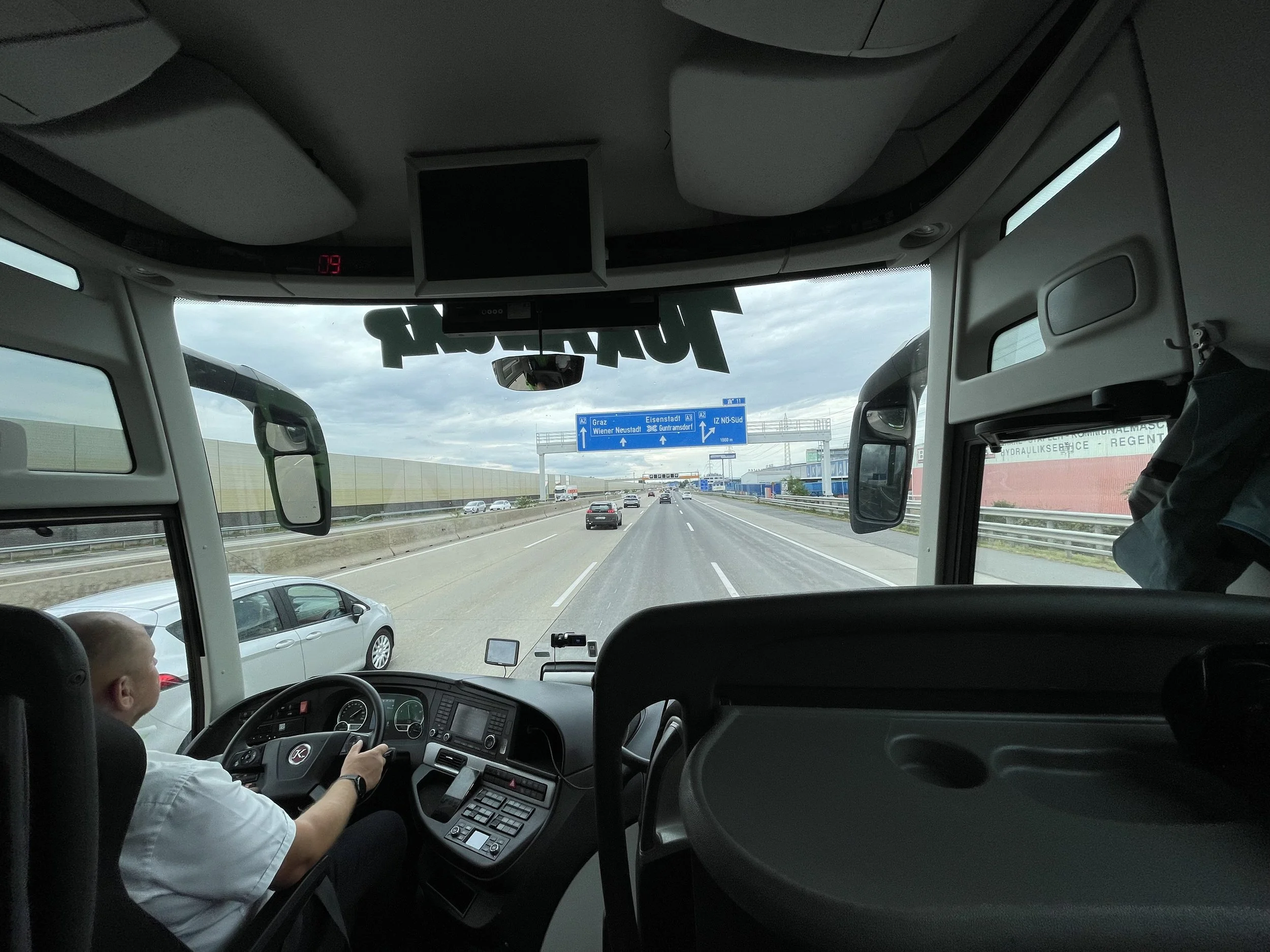Our bus left exactly at 9:25 am. N. somehow got obsessed with the fact that it was in Lane A4 when it should have been in Lane A5. He had paid extra for seats in the first row, for what the company called the “panoramic view”. The bus was staffed with one driver and a spare — it began its route in Bratislava and over the course of a long day would finish in Milan, so the two drivers would take turns.