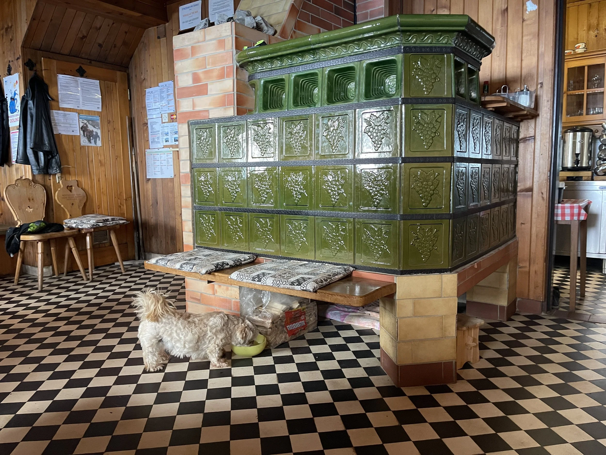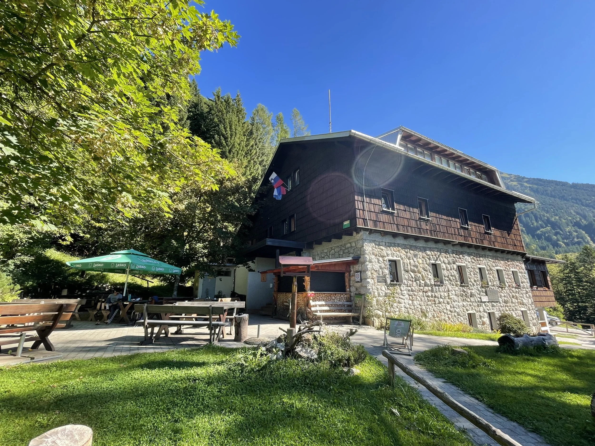 Our first break was at the Valvasorjev dom pod Stolom hut, charming with an outdoor spigot for water (“voda”), cozy hut with a main room decorated with hiking memorabilia, and picnic tables outside. And flushing toilets; these we would miss higher up. The lady working in the hut seemed a tad disappointed that we didn’t order any drinks and wanted only one bowl of a stew called “toja”and without a klobasa, no less.