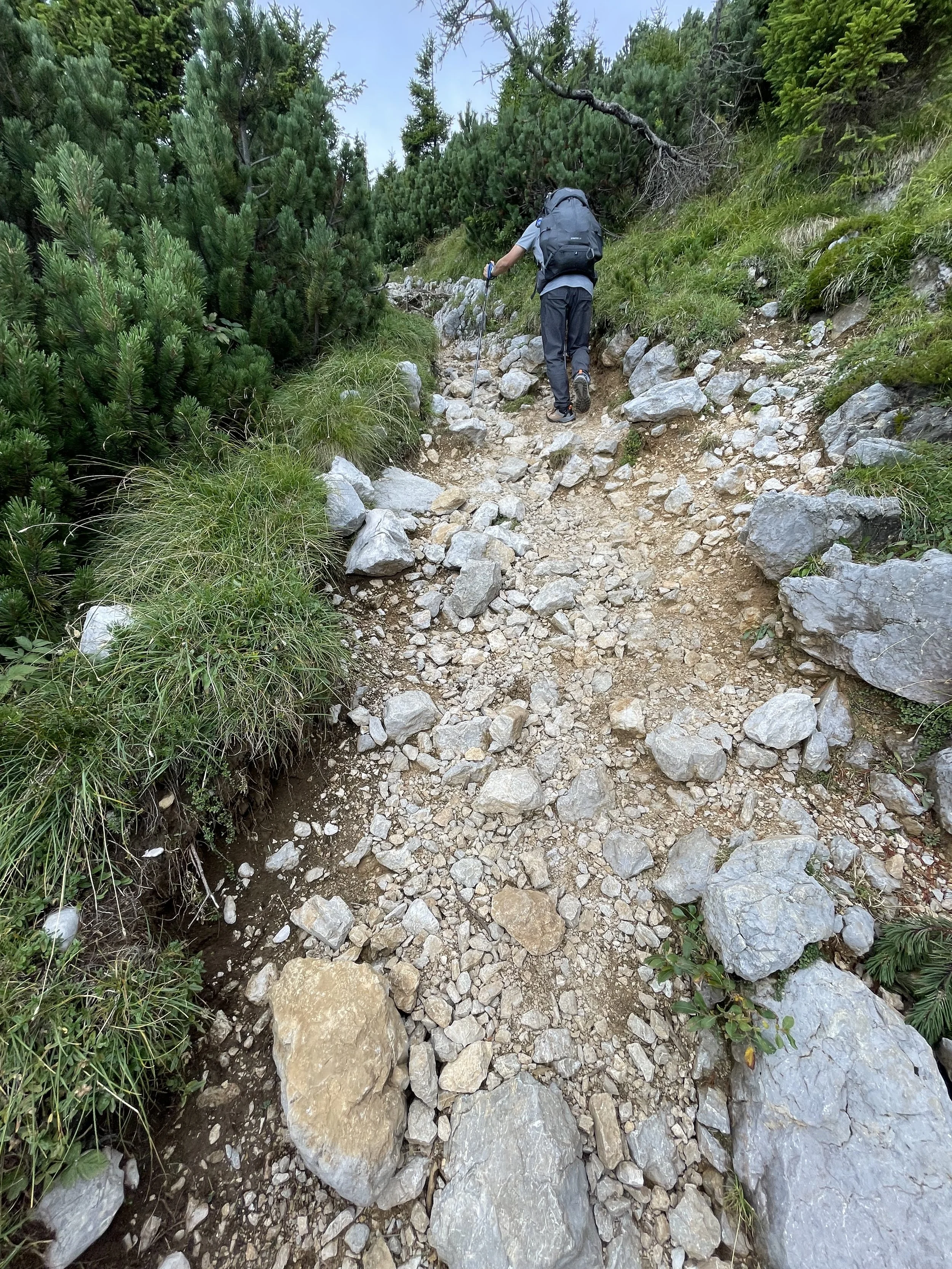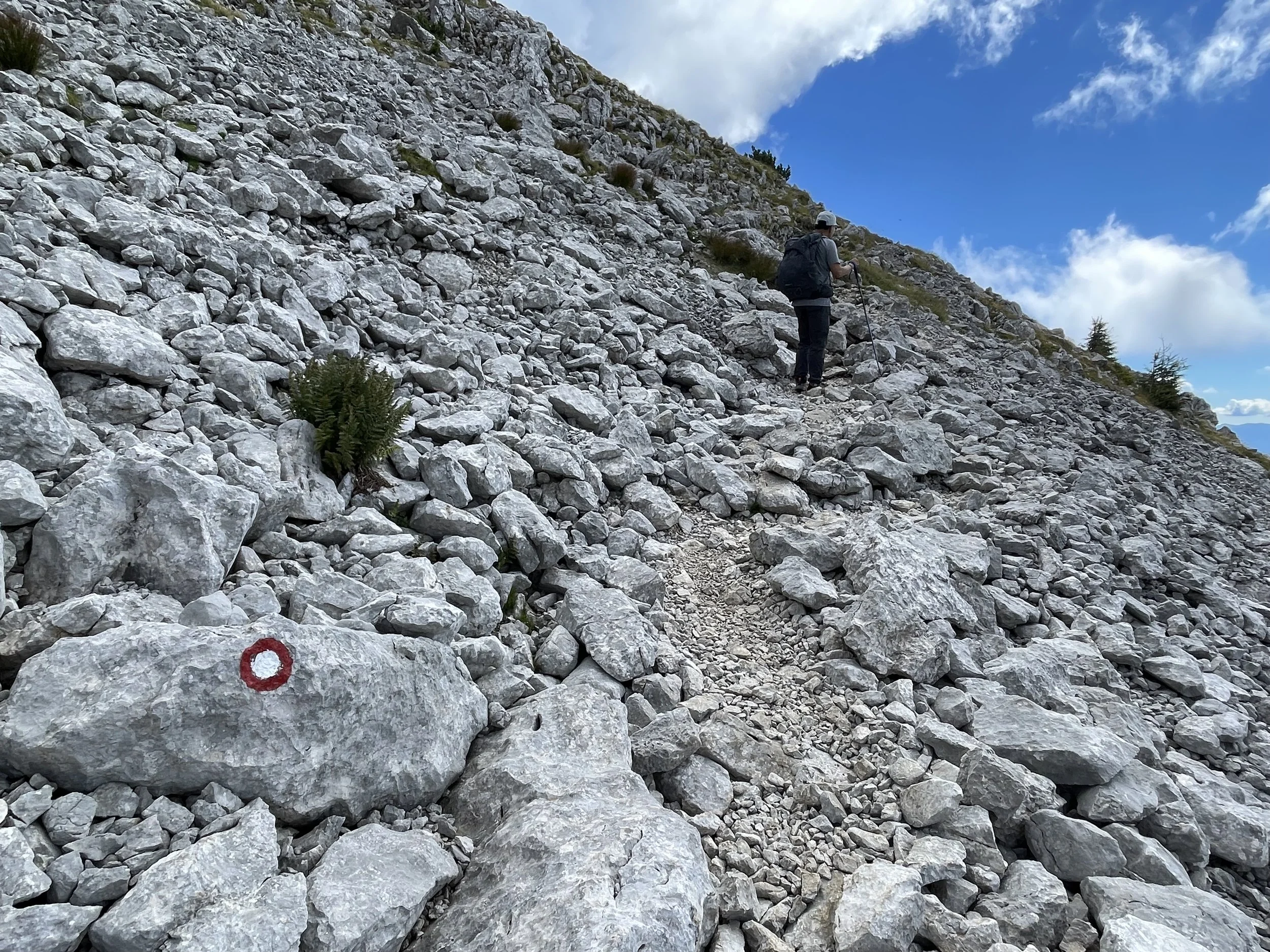 Rock and rock and more rock. And still unrelentingly uphill. We were both tired and cranky because there had been a few spots that were quite dangerous, where a misstep would have led to falling off the side of the mountain. We were reminded of yesterday’s experience hiking up to the viewpoint of Lake Bled.