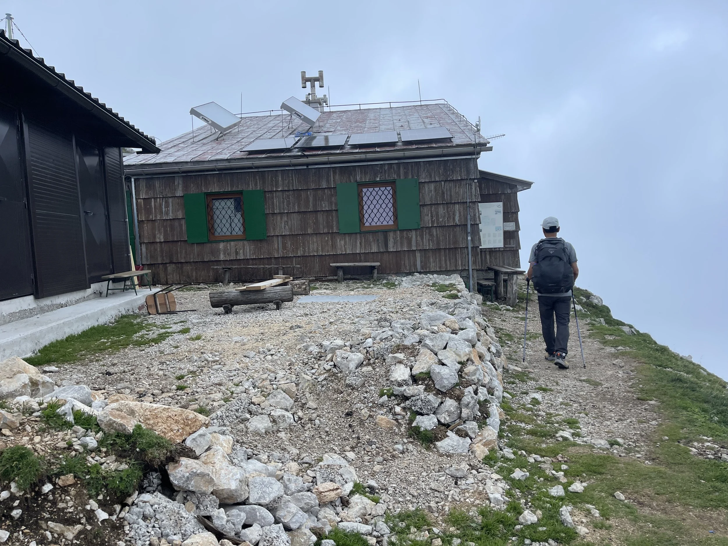 The hut Presernova Boca na Stolu sat on a narrow ridge below Mt. Stol, comprising of the main hut, an outhouse (the flushing indoor toilets were out of commission because of the lack of rain, as the helpful handwritten sign indicated), and some sheds for the generator and propane tank.