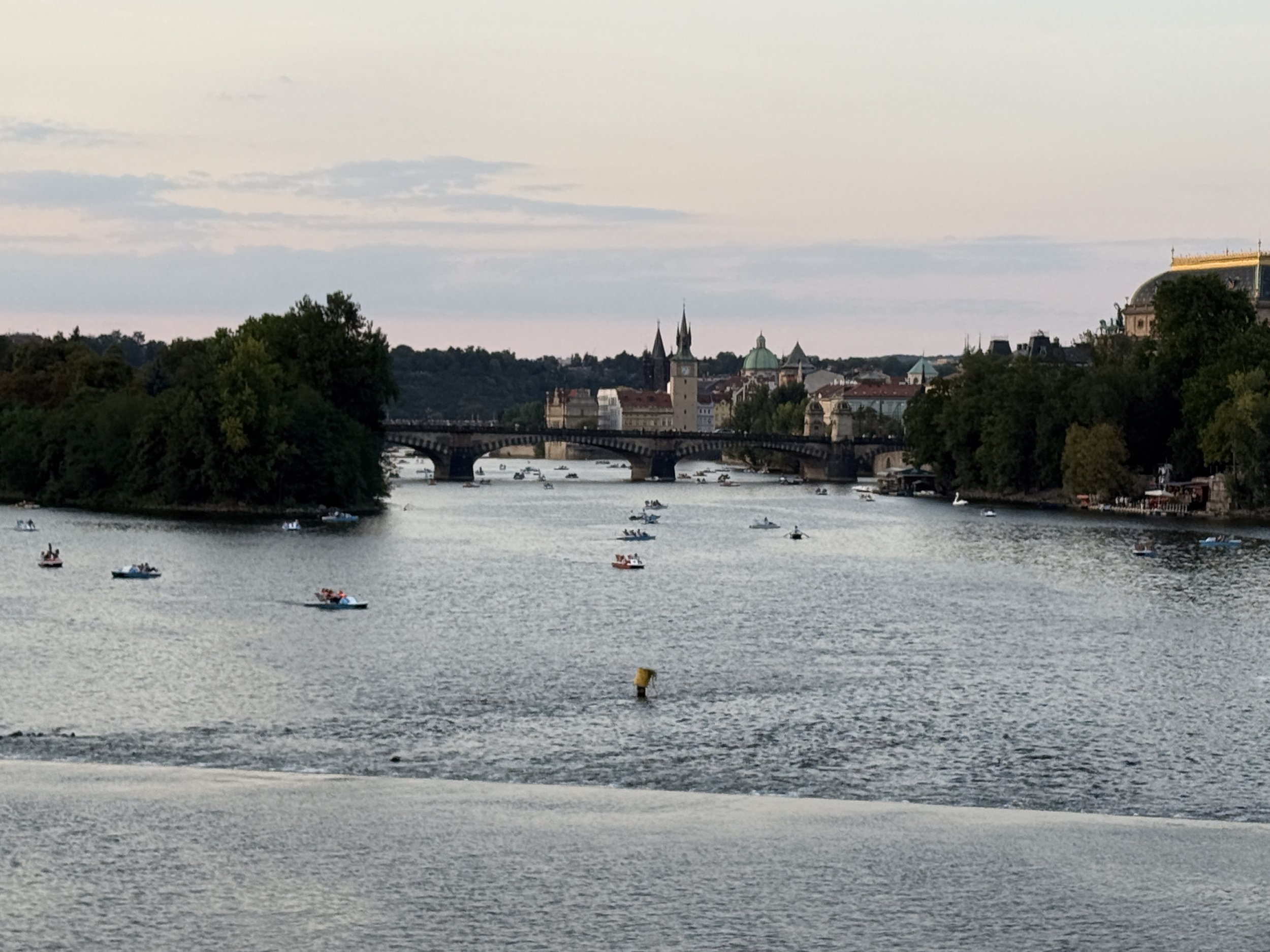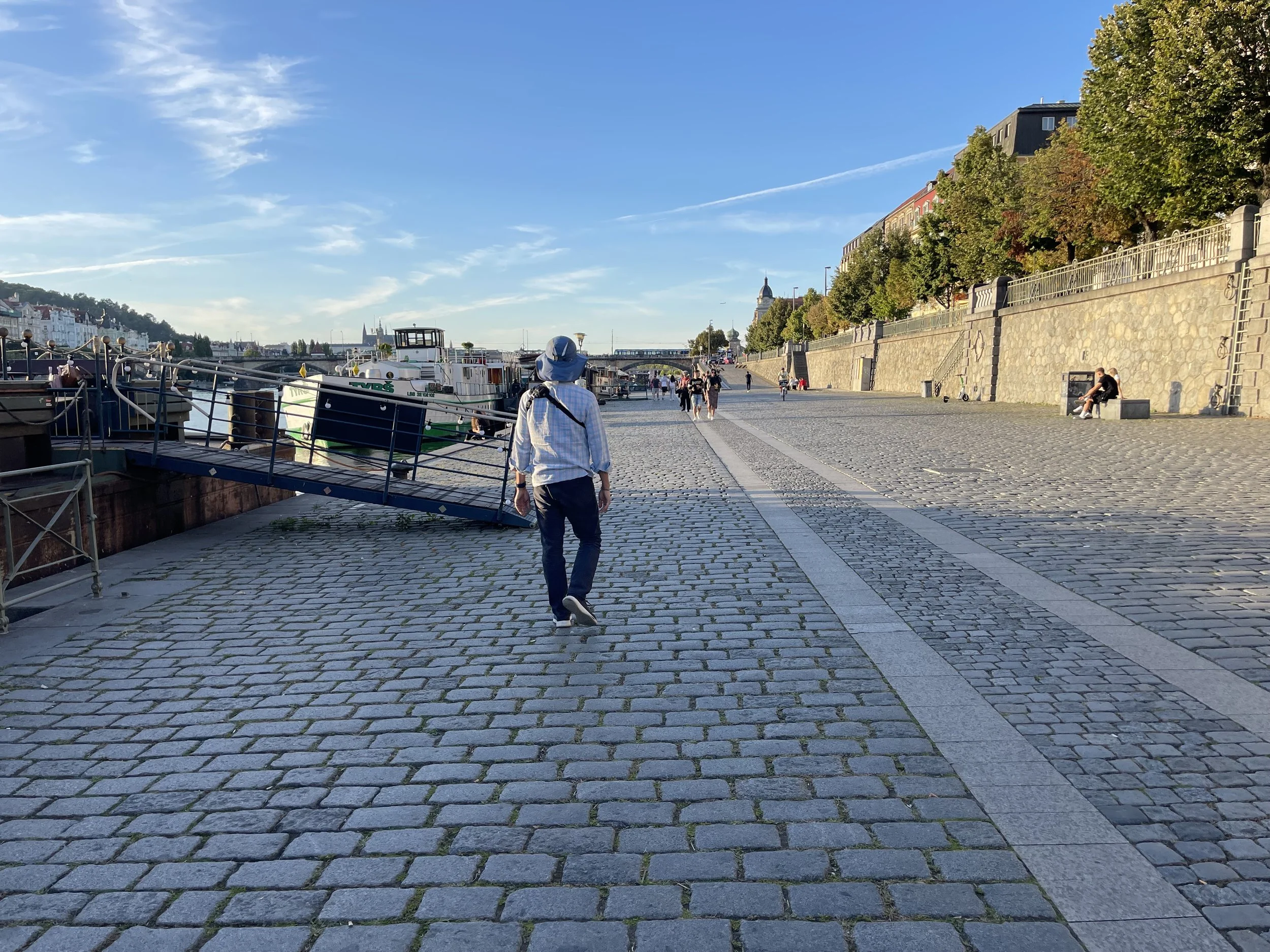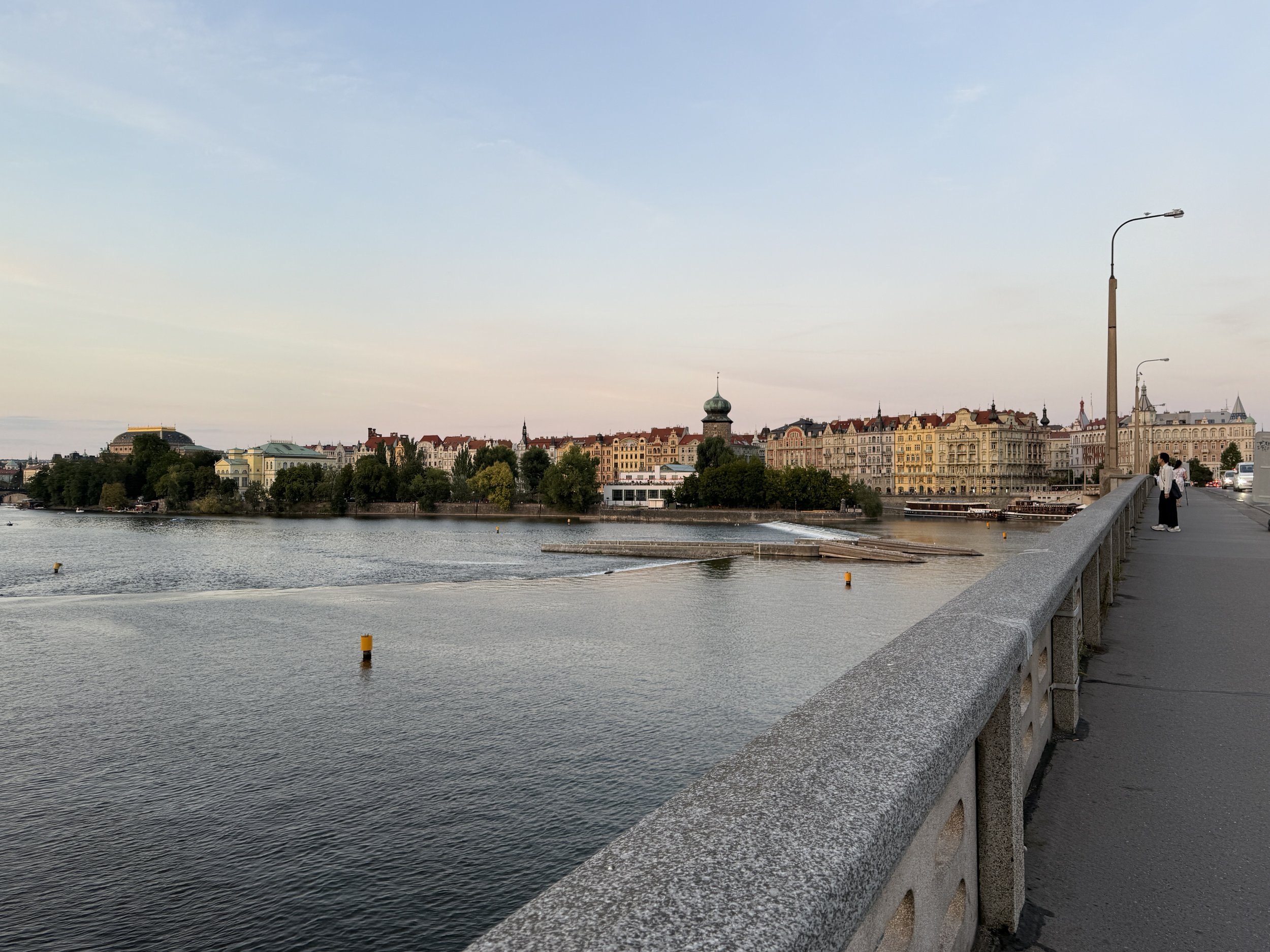After a long nap, we walked around a nearby park with nice views of the old town and, without meaning to, ended up descending from the grounds of the monastery on the hill all the way to the Vltava River. Walking around the riverbank in the late afternoon sun, we admired the city and the Prague skyline. And manhole covers — this city has beautifully intricate manhole covers.