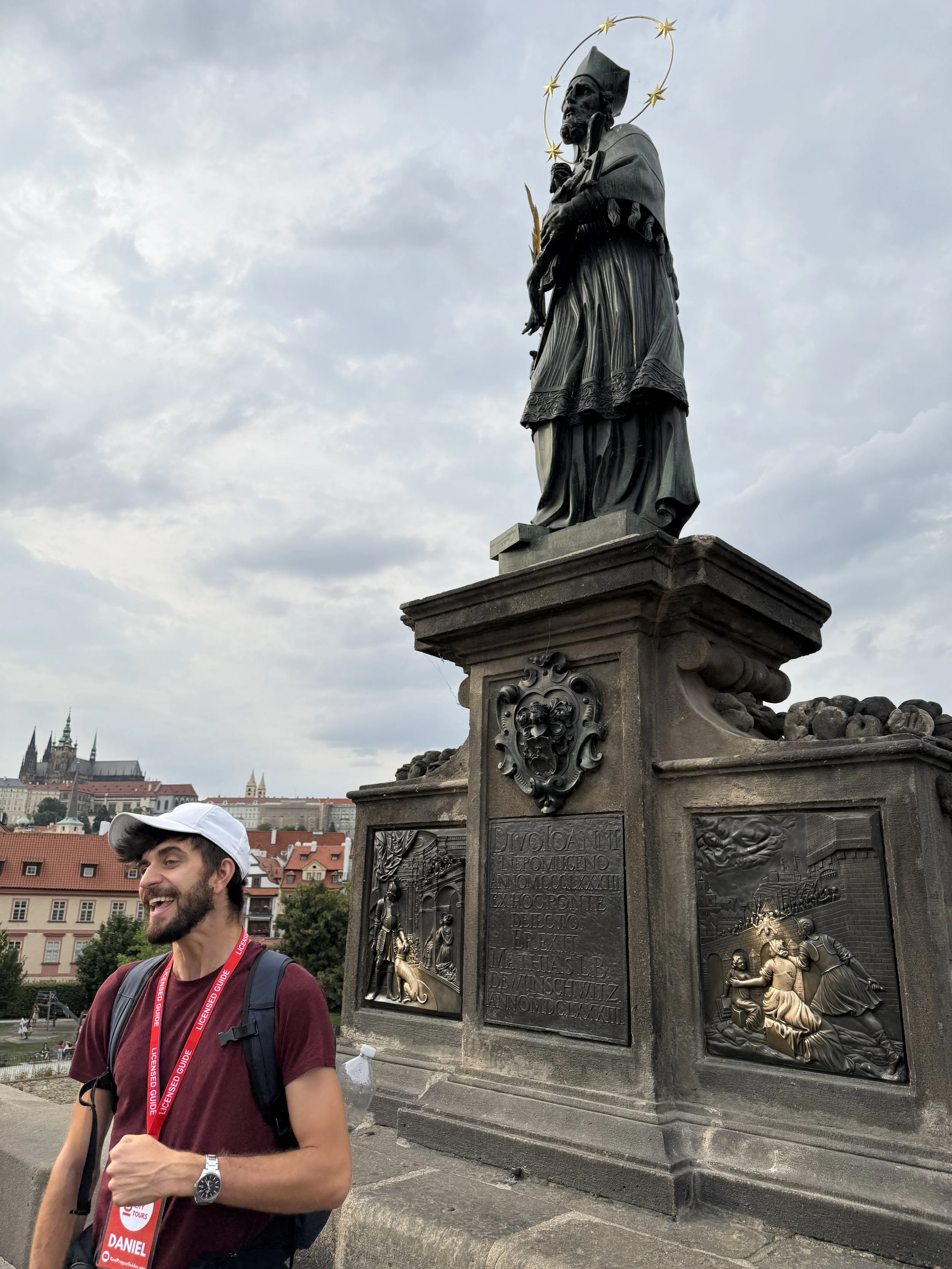— the Charles Bridge and the statue of the saint with the five stars who was thrown in the river when he did not want to rat out some lady’s secret. Now tourists come and rub part of the panel, and legend says that as long as the they keep their wish a secret, it will come true. The thing that we tourists do…