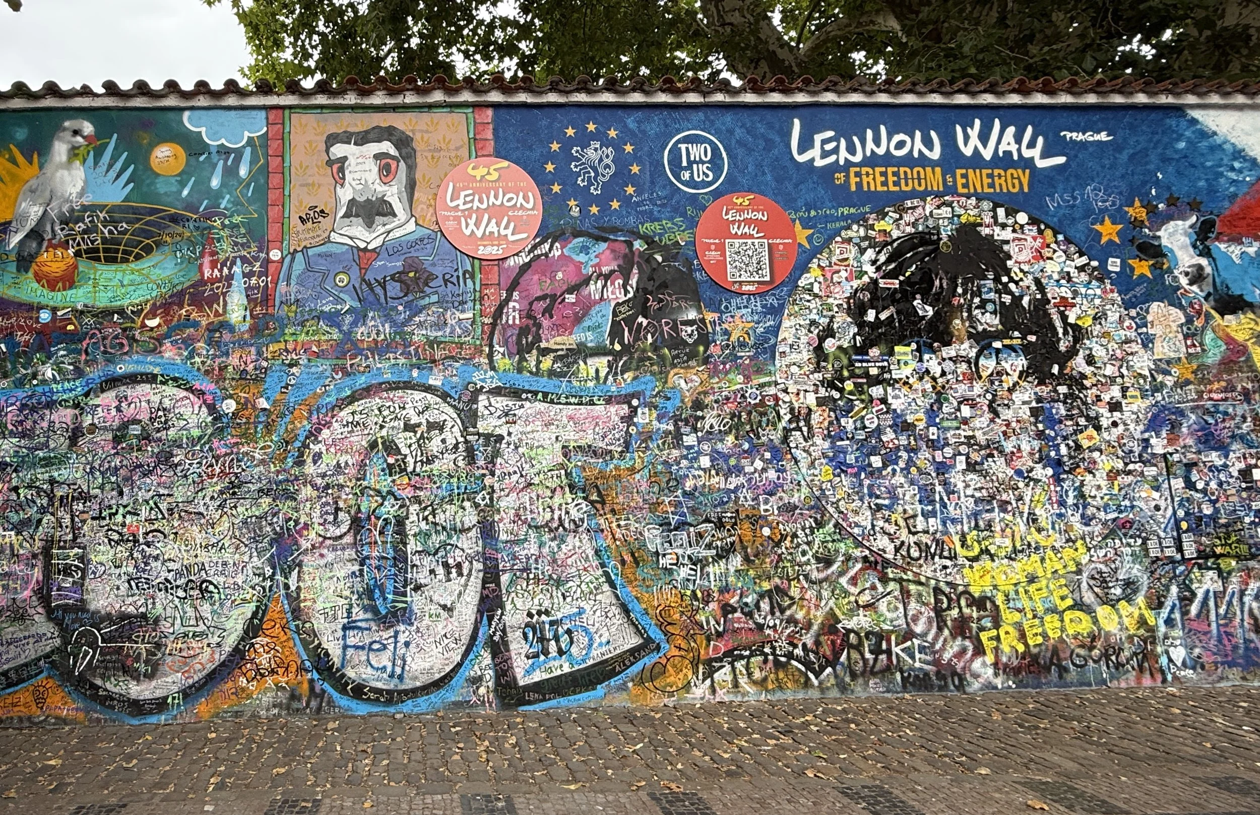 — the John Lennon wall, covered in graffiti art. Against the spirit of graffiti artists, supposedly one needs permission to add to the wall. And yes, there’s a security camera keeping watch.