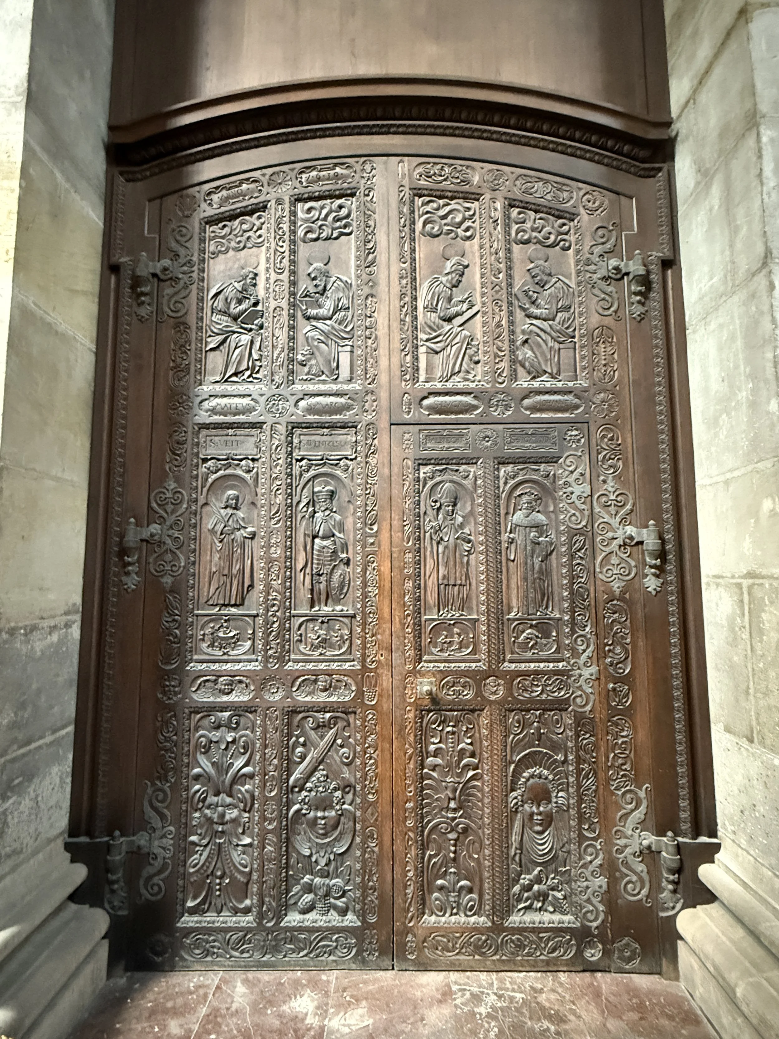 — St. Vitus Cathedral: with the crowds of people entering the church, I had been afraid of N.’s taking pictures, which might disturb other people’s enjoyment of a religious setting. But I didn’t have to worry: construction crews were dismantling scaffolding and the sound of metal bars and planks echoed loudly through the interior. N. seemed particularly fascinated by the doors in the place — mostly of wood, intricately carved with multiple stories and messages.