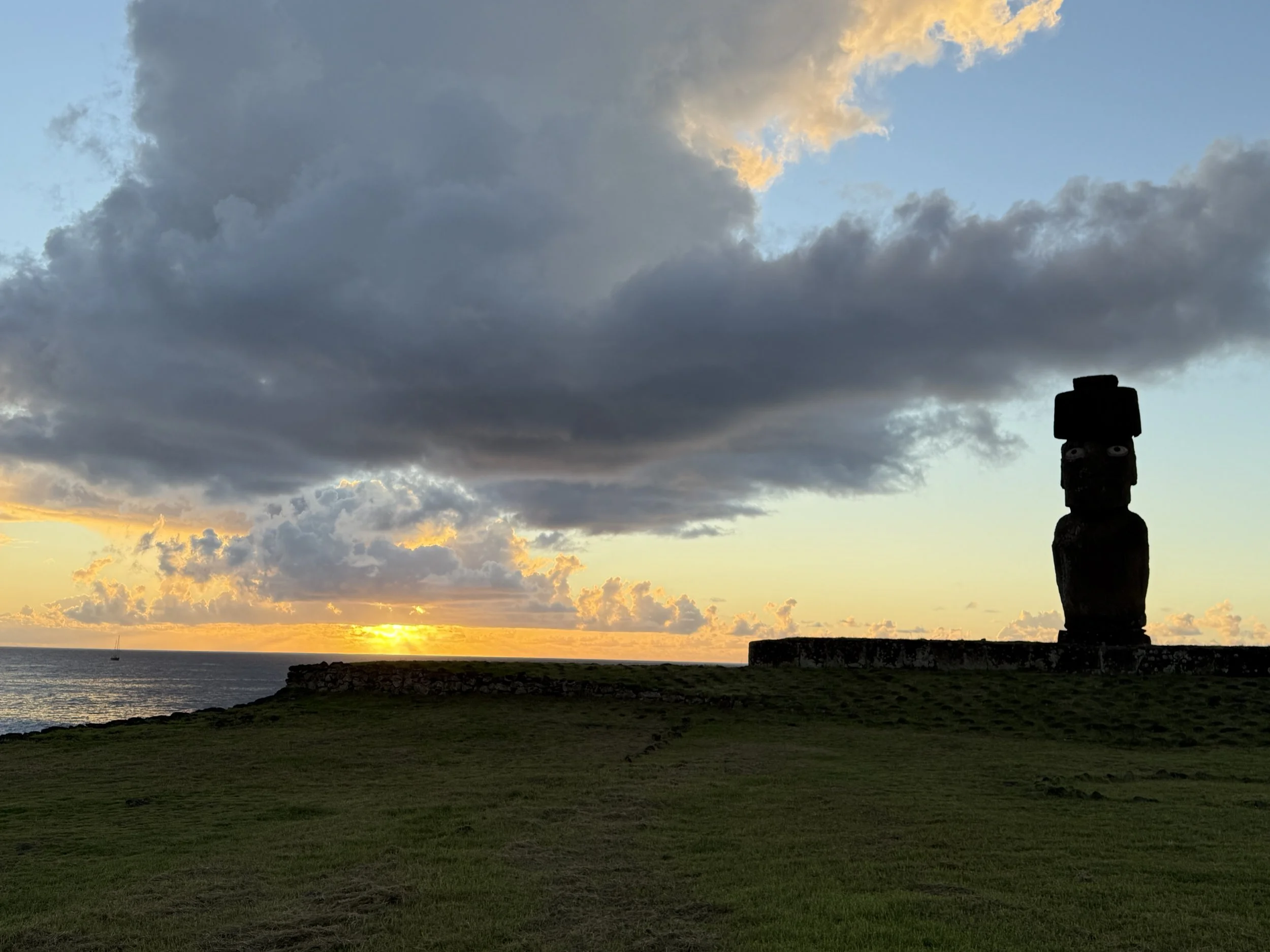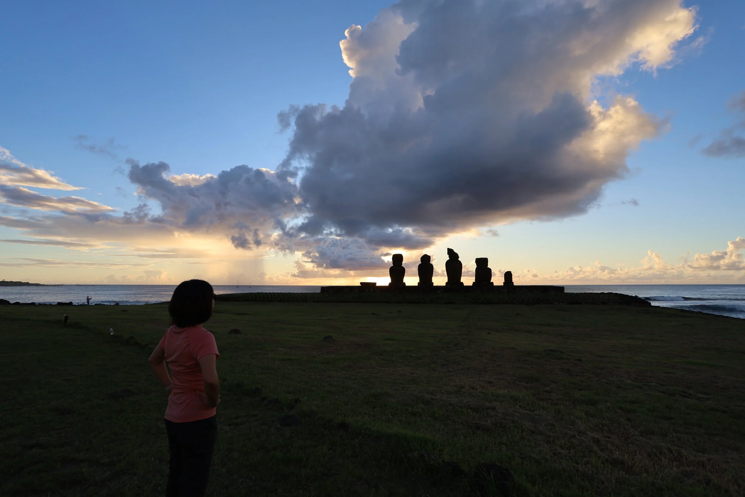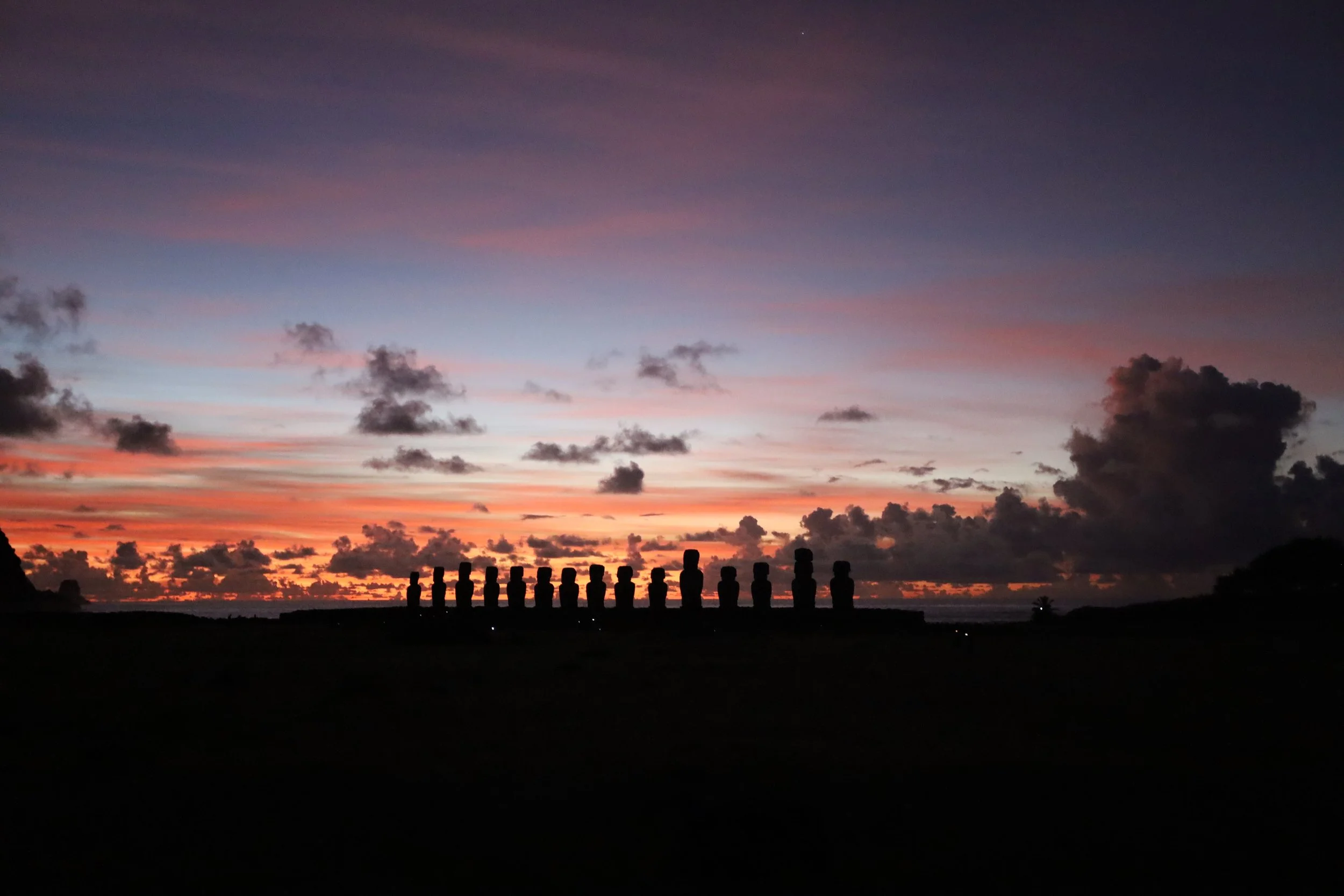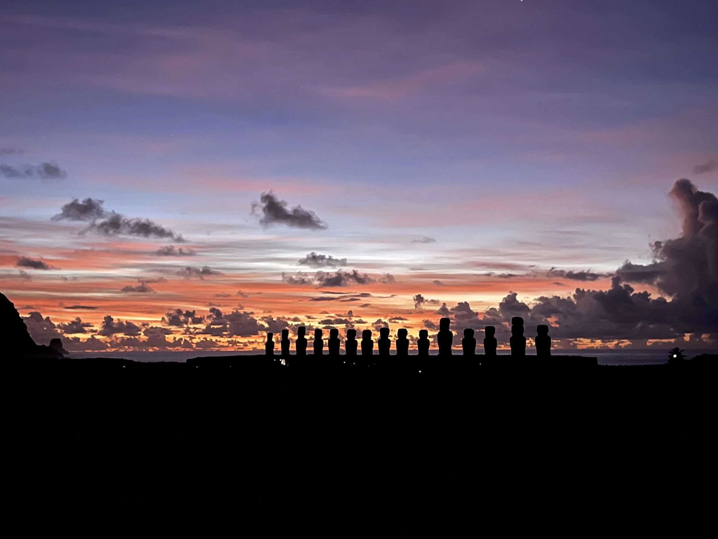 The magic happened slowly and quickly, or maybe it’s just our sense of these things: we kept our eyes on the moais, and the colors behind them kept shifting from black to lavenders to pinks to oranges and yellows. The presence of clouds obscured our view of the sun rays, but they were welcome canvasses for a whimsical sun which kept painting the sky in different shades.