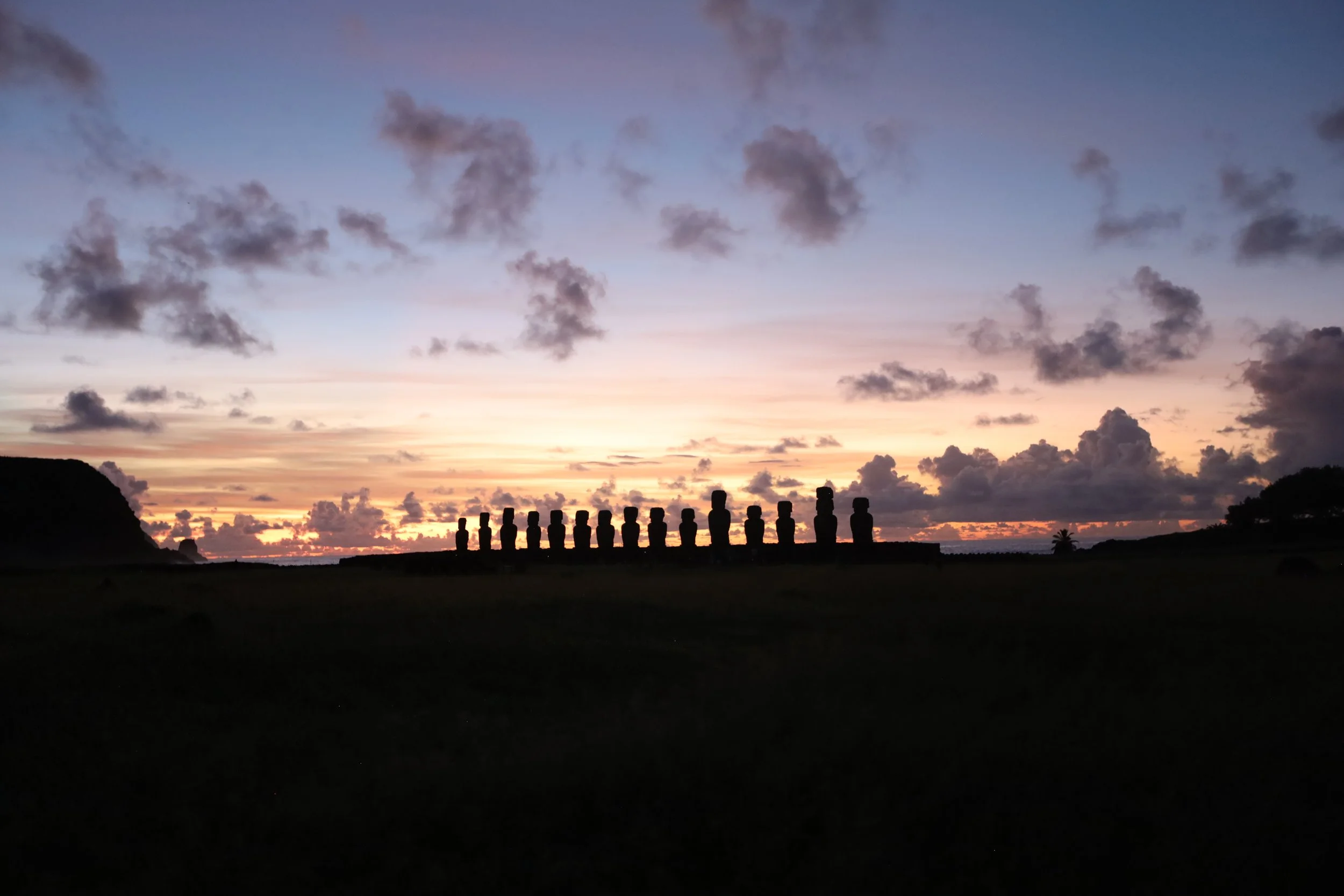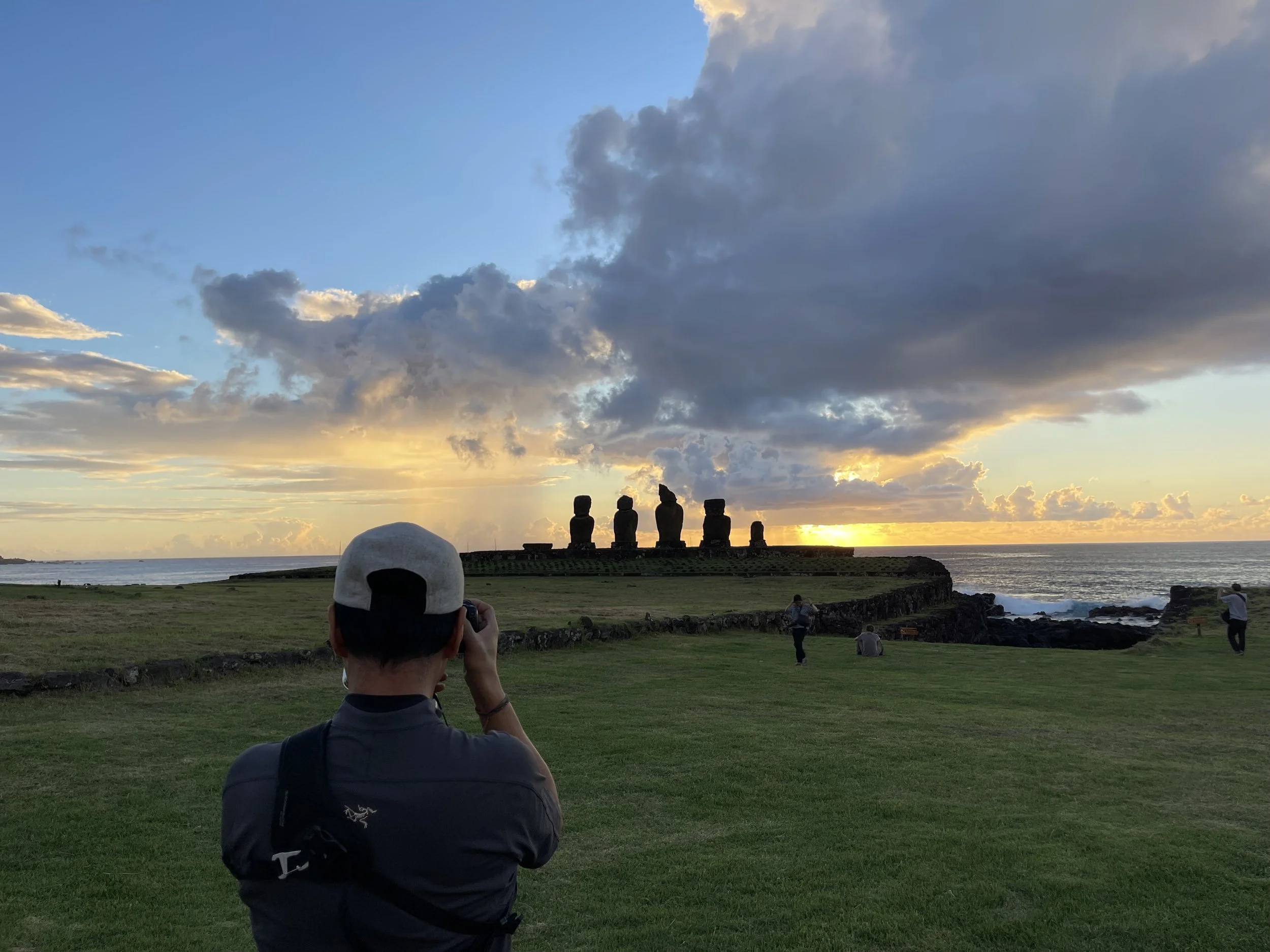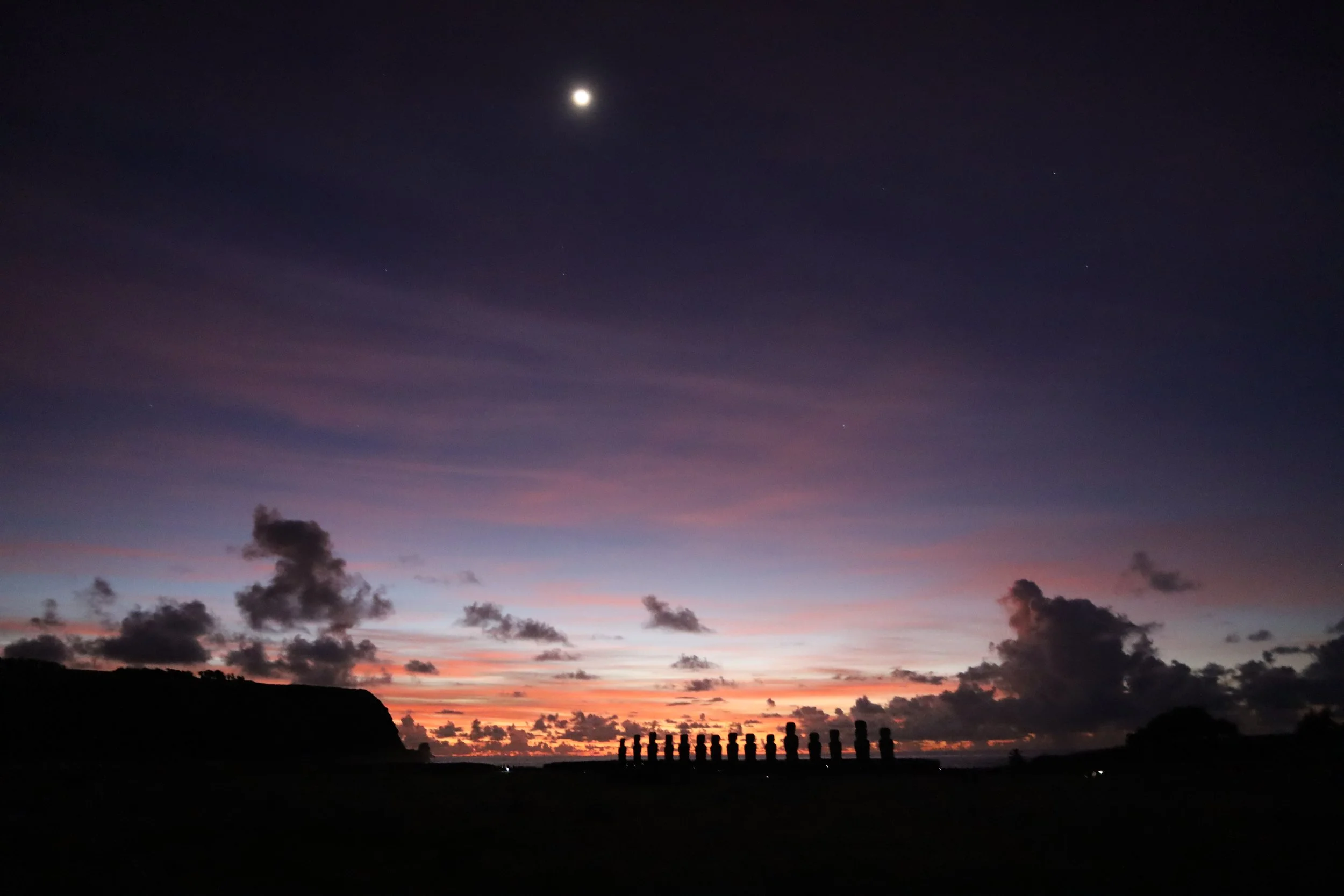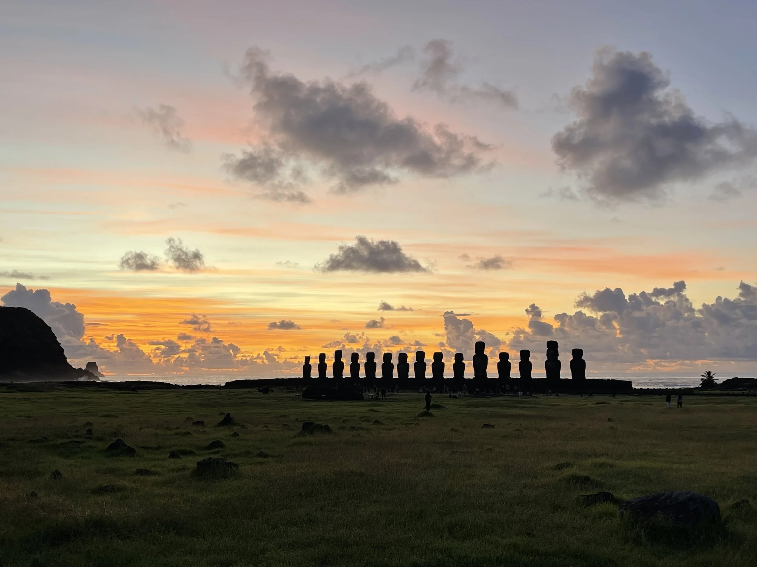 The magic happened slowly and quickly, or maybe it’s just our sense of these things: we kept our eyes on the moais, and the colors behind them kept shifting from black to lavenders to pinks to oranges and yellows. The presence of clouds obscured our view of the sun rays, but they were welcome canvasses for a whimsical sun which kept painting the sky in different shades.
