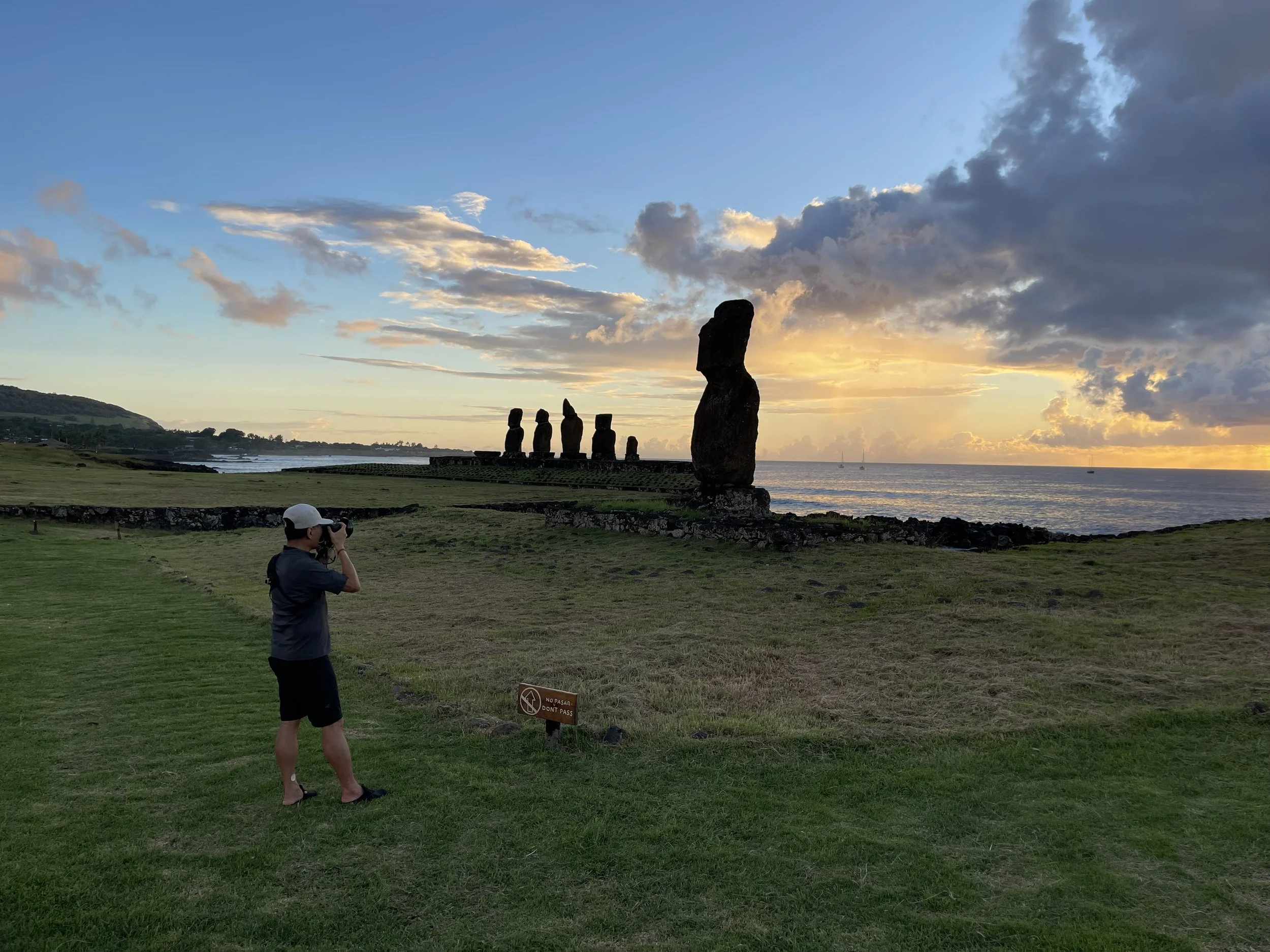 Ahu Tongariki — 15 moais by the sea, where the guide posed N. just so, to look like a 16th moai.