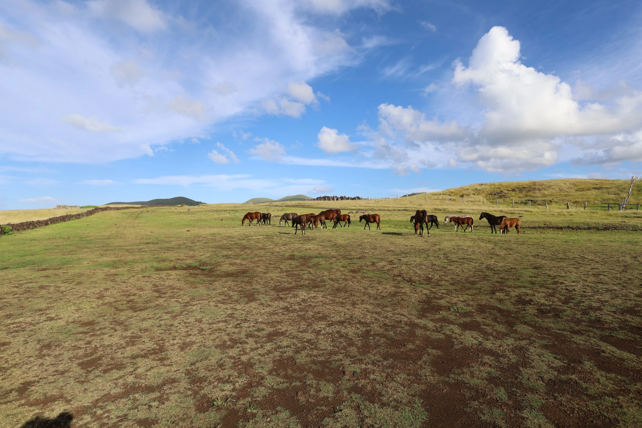 Just a couple of hills later, we reached Terevaka, with its sign, a mound of sticks, a moai replica and a horse skull. From this vantage point, one could get a 360 degree view of the horizon line on the sea.