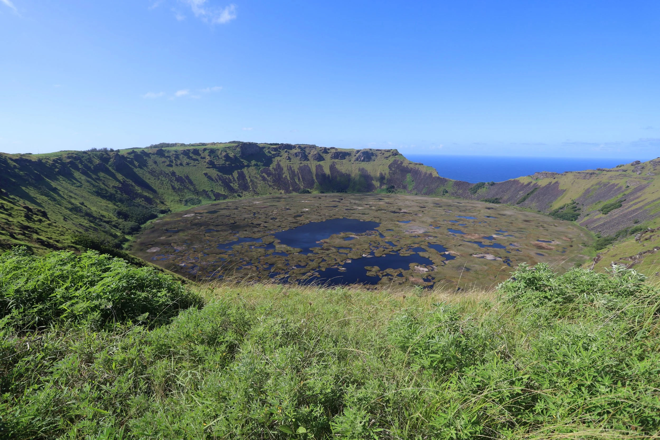 We got to Mirador Rano Kau where a refreshing breeze blew. The view of the inside of the volcano was impressive indeed: the crater was now a lake, and the surface of the lake had little “islands” — formed by twigs, or branches, or other organic debris — on which grass and other plants now grew. On the other side of the crater, we could see the ocean.