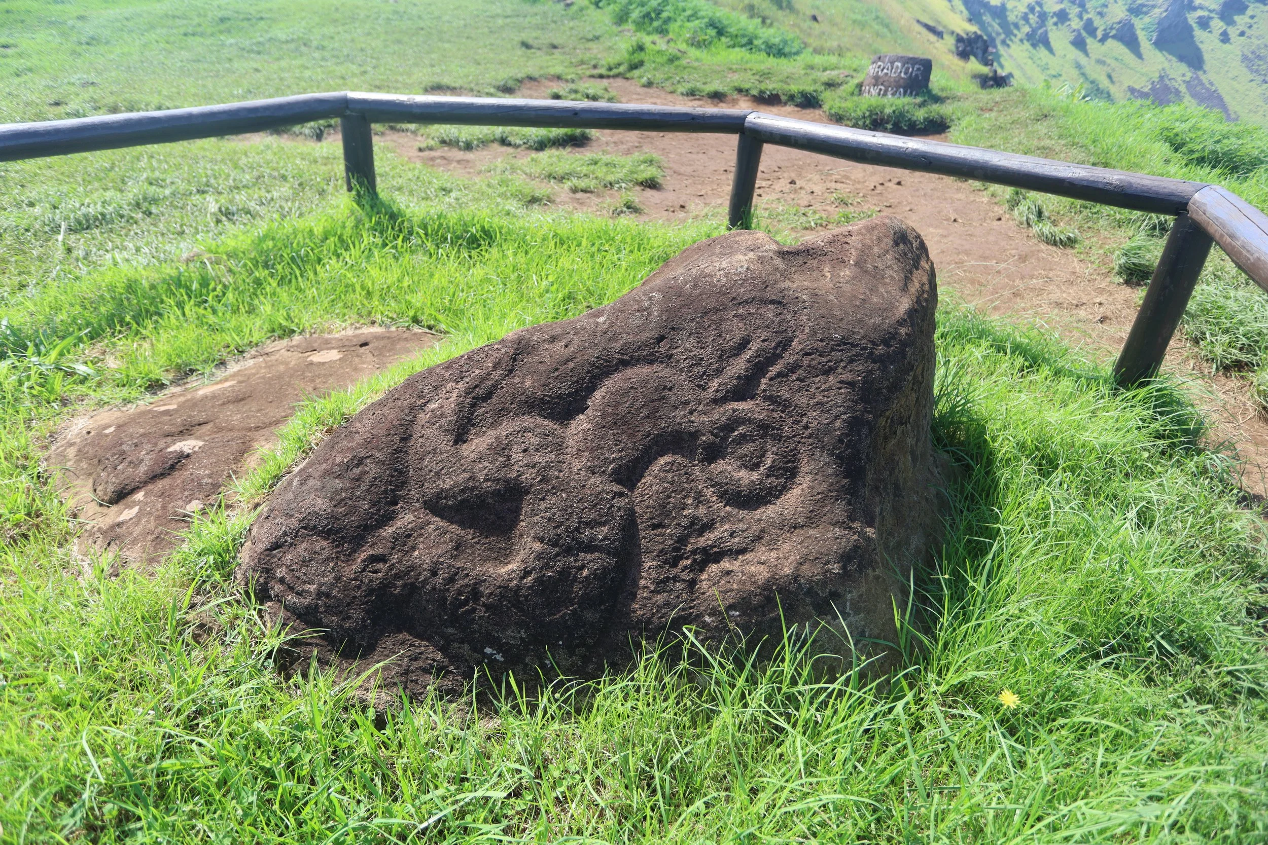 We tried to continue on the trail to the Orongo visitor’s center, but here also the wild grasses grew past our chest and, after attempting the first few feet at the edge of the crater, we were worried that we might slip and slide and join the microbiome on the crater’s bottom. We turned around and took the road to Orongo, where I pestered another park worker for a stamp. (To visit the museum on site, one had to have a guide.)