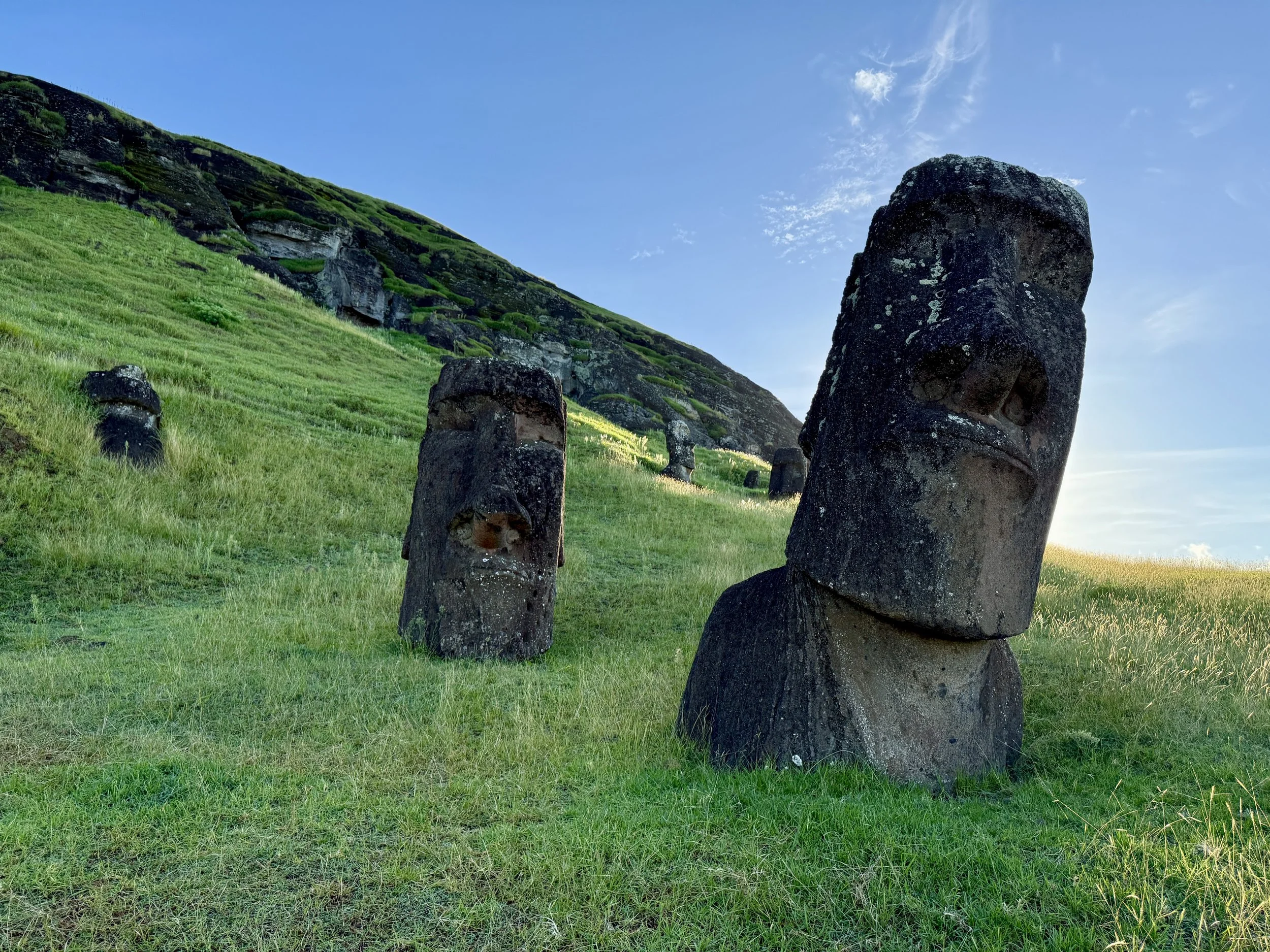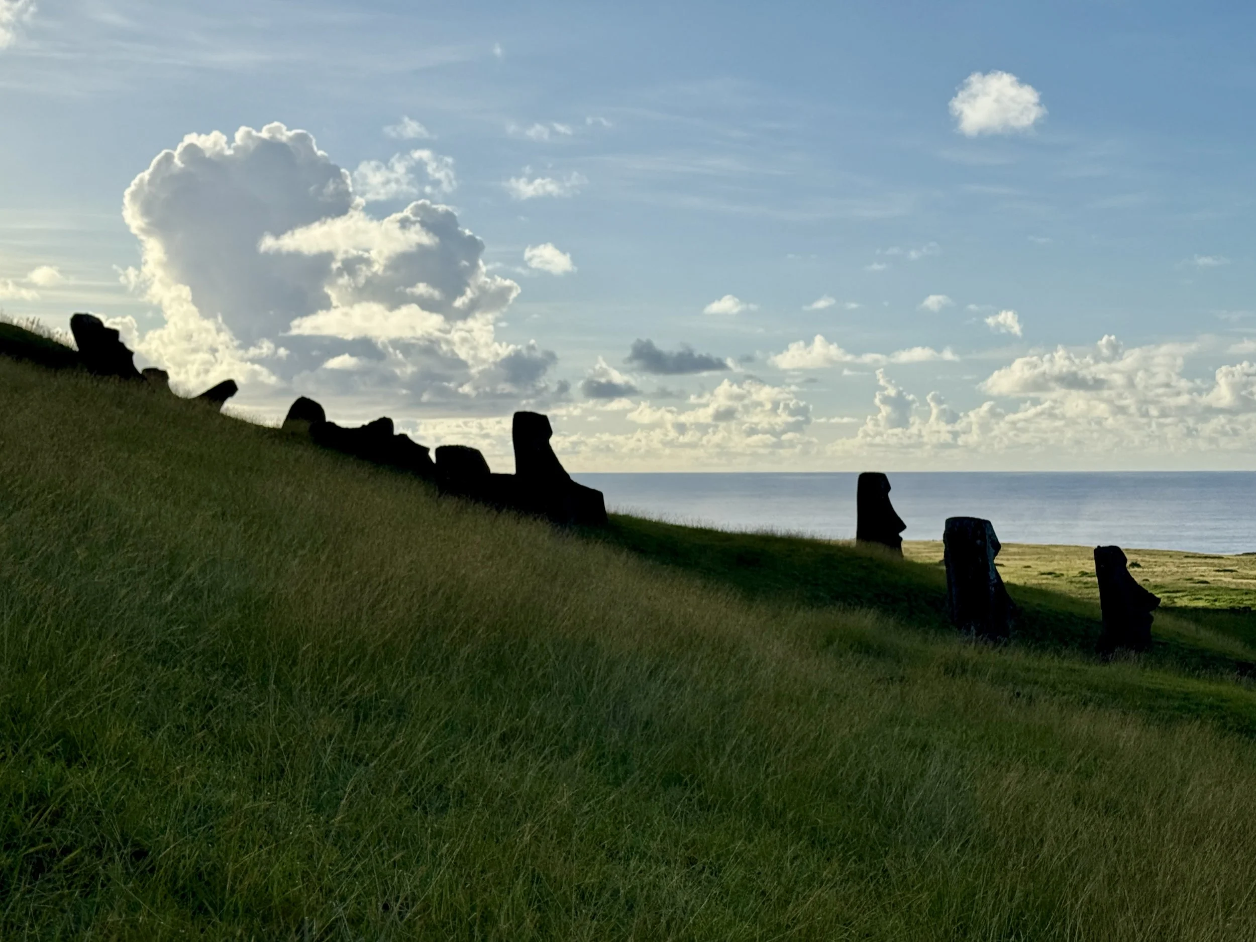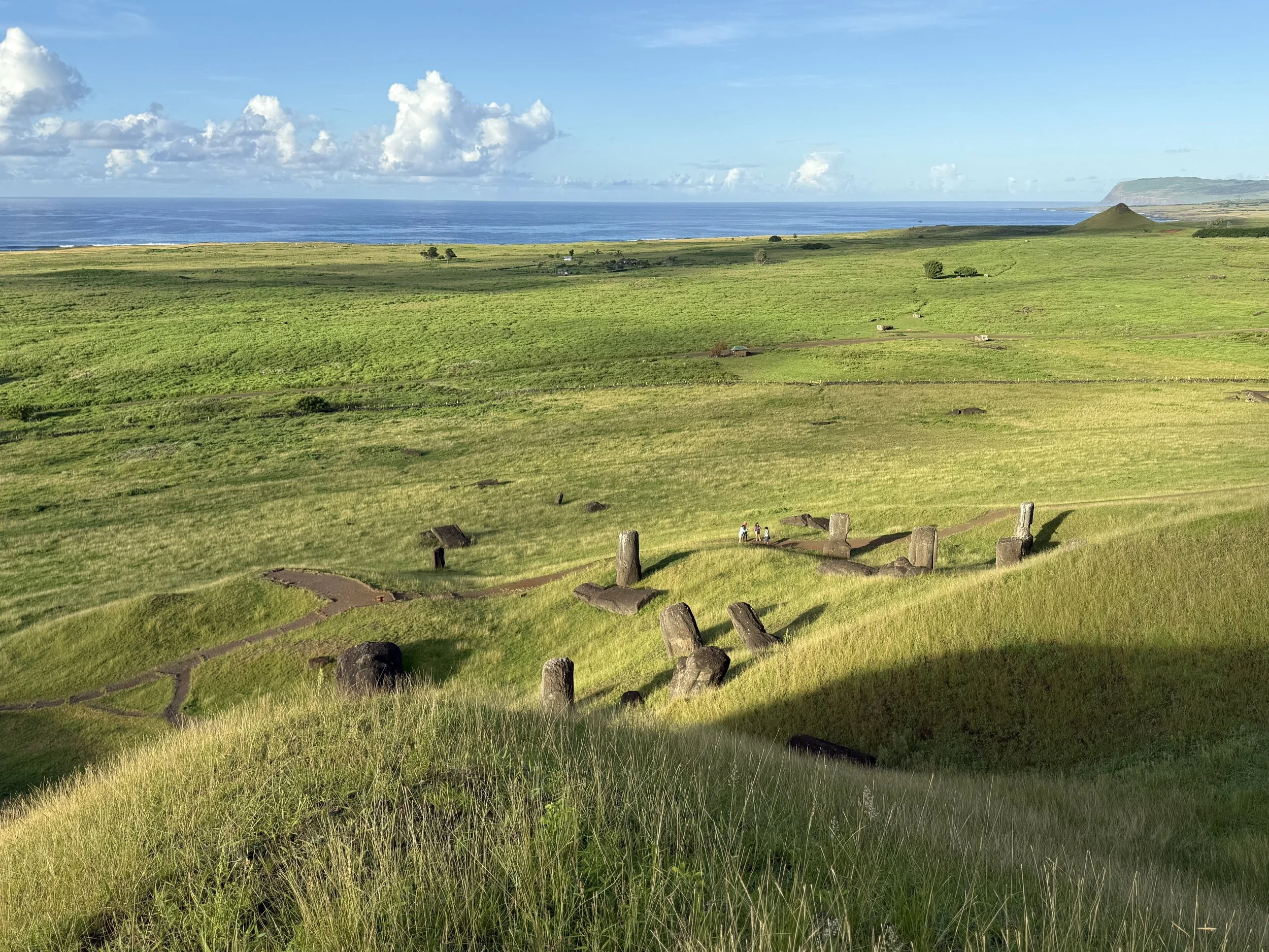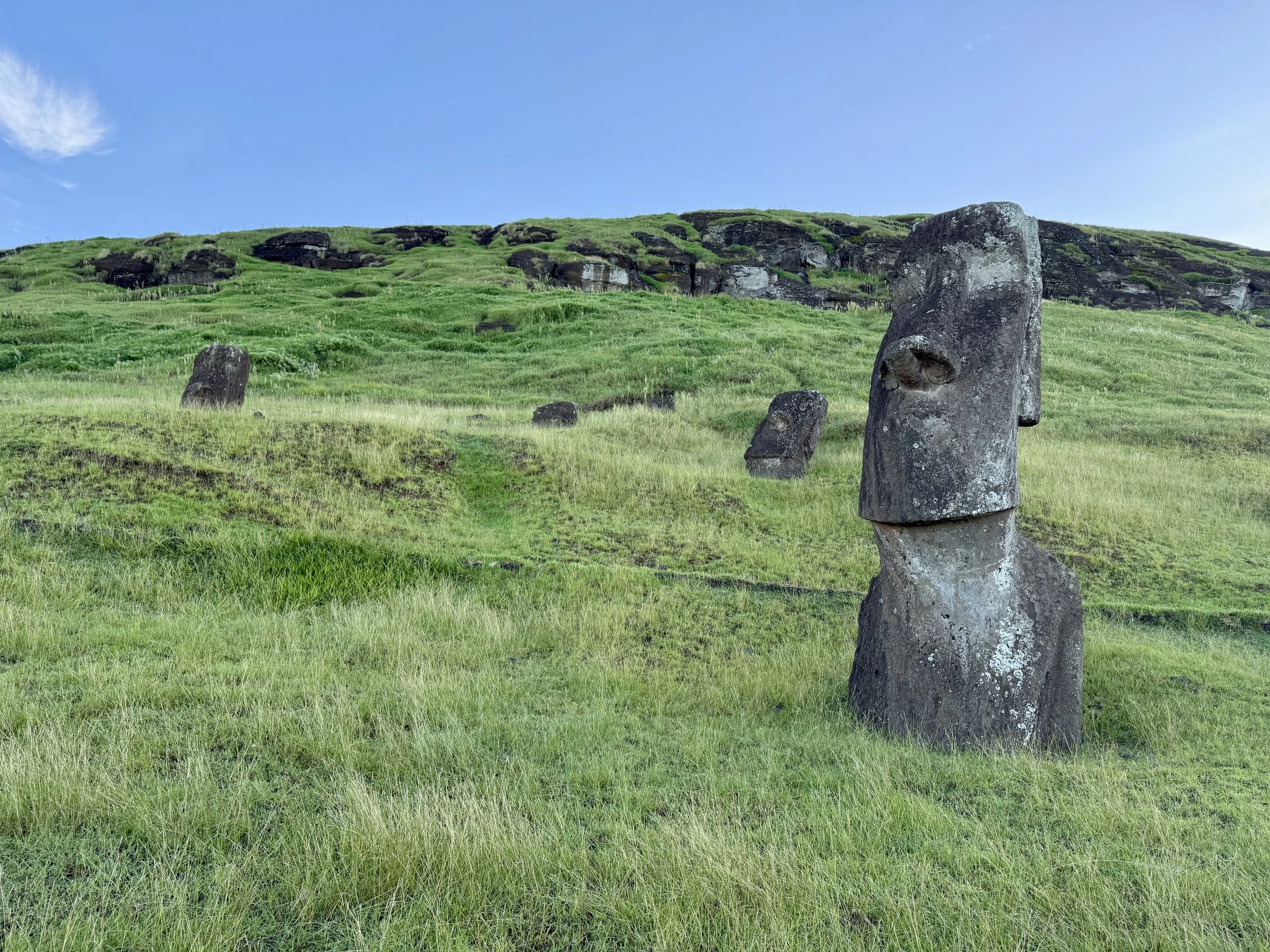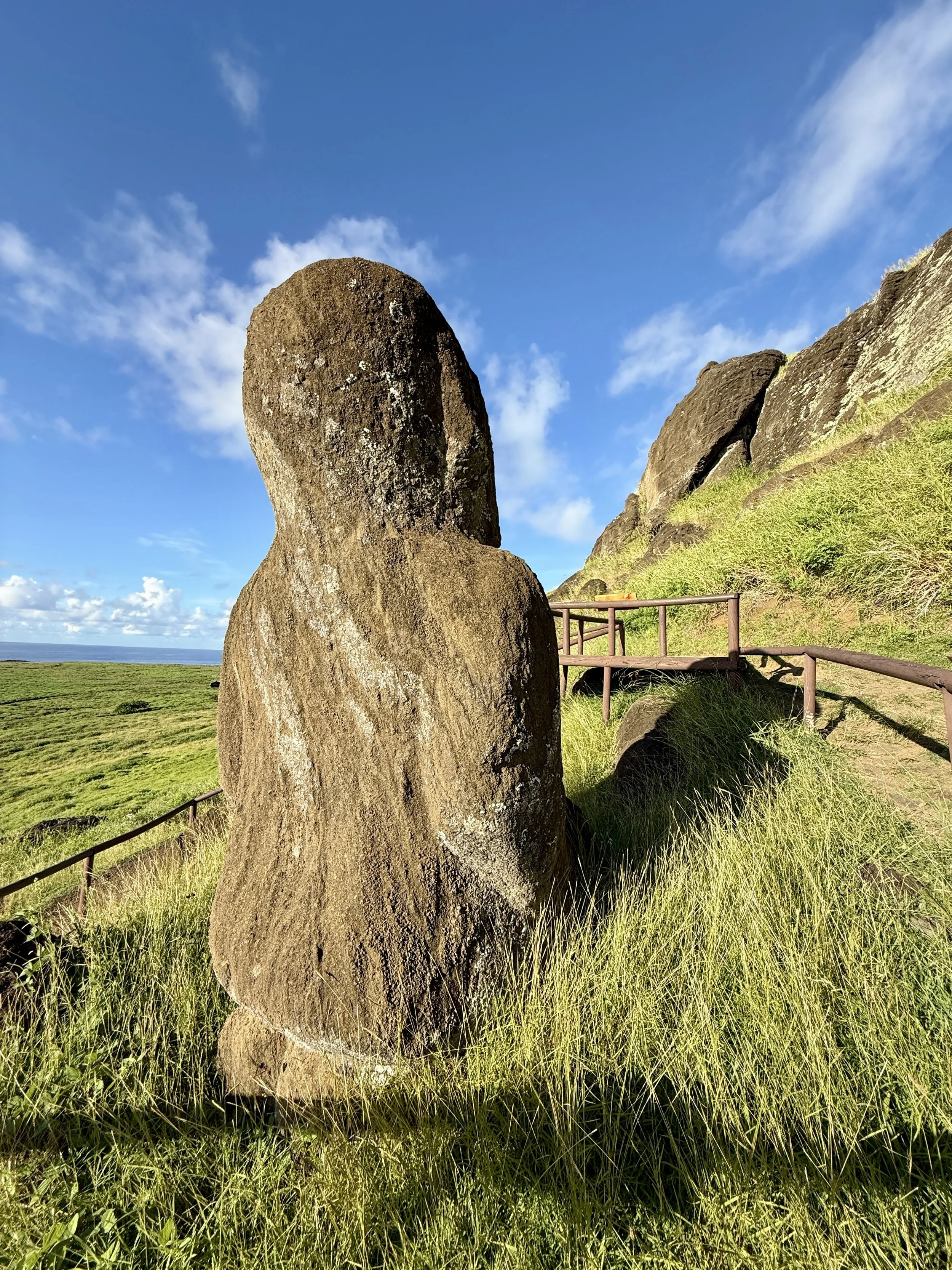 One can see the ancient assembly line — literally moais still attached to the mountain, moais standing up (throughout the years, as they’ve stood there, rain and the elements had eroded the mountain, which as dirt and soil and rock accumulated, buried the statues), moais in line in a deep channel headed to ahus around the island, moais broken and left where they fell, one special moai with legs and kneeling in prayer — in short, moais up to here!