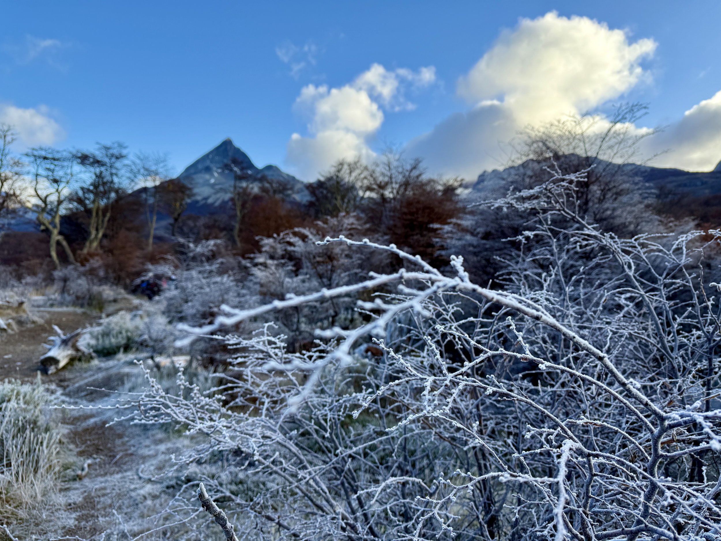 The trail began under tree cover, mostly lenga trees that had already dropped their leaves for the season but whose branches were festooned with “chinese lanterns” — some type of invasive yellow moss that hung on the branches. The trail was well marked and, although muddy, this early in the day the mud was still frozen solid and easy to glide on. N. seemed, for the first time in this town, charmed by his surroundings and kept stopping to take photos.