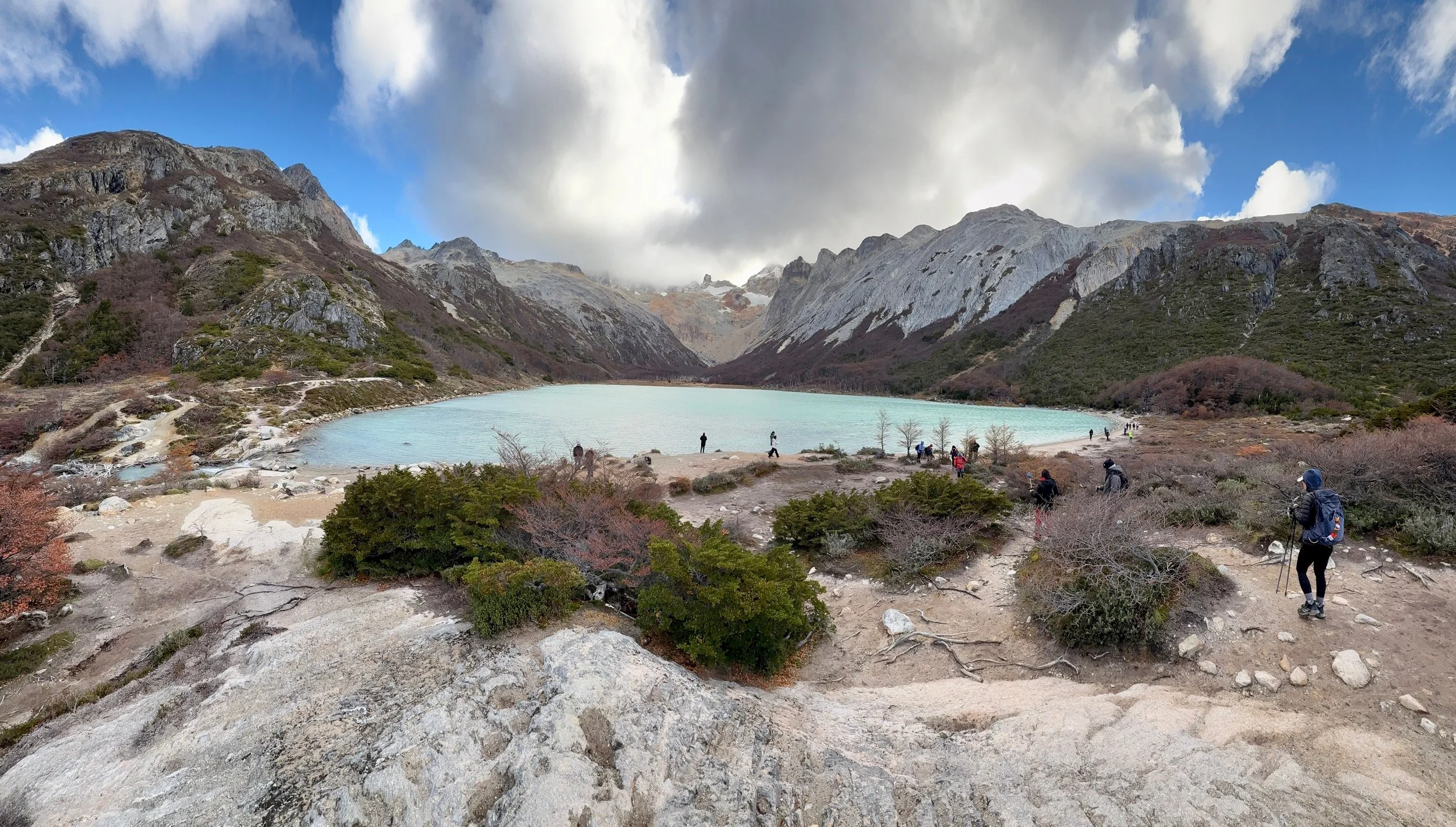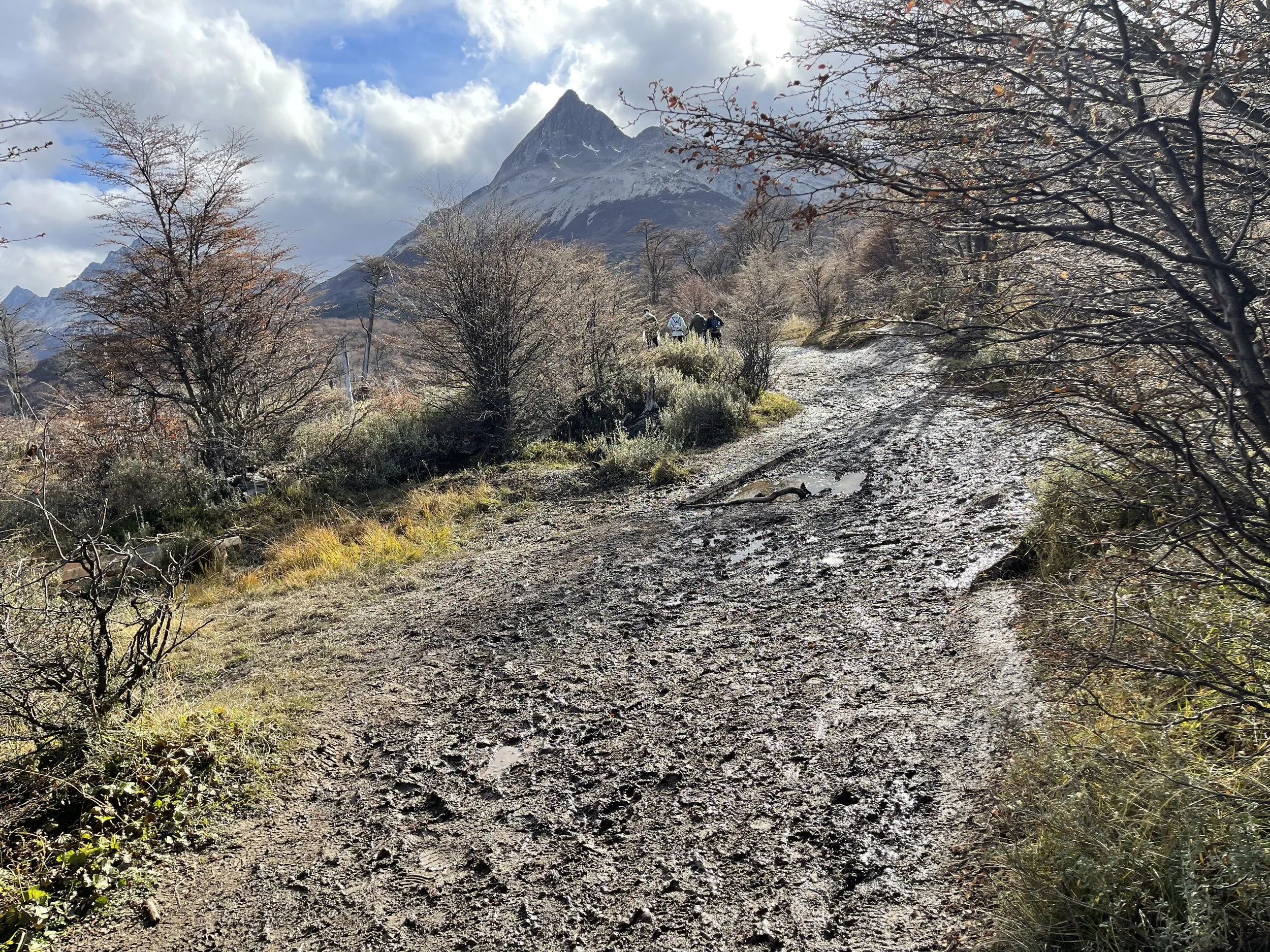 It was time-consuming work to carefully discern where to put each step. Did that spot look firmer? Was there a tree branch that could provide some support? Should I veer off the trail altogether and set off like a pioneer and make my own trail? The problem with this last method was the fact that it led to stomping on tree roots or bushes that, through no fault of their own, became victims of even more deforestation — the beavers were not the only culprits. And so here, as I picked my way through this or that muddy path, I inwardly cursed the park management which had, I realize, unpalatable options: either close the trail and build some paths that are hikable in order to avoid further damage to the area, or keep the trail open and draw the ire of hikers over badly maintained trails. But I realize that closing the trail is probably a no-go: it’s the most famous hike in El Fin del Mundo! (I saw a young woman close to the beginning of the trail, wearing a pair of brand new white sneakers. I would have loved to see what they looked like once she came back.)