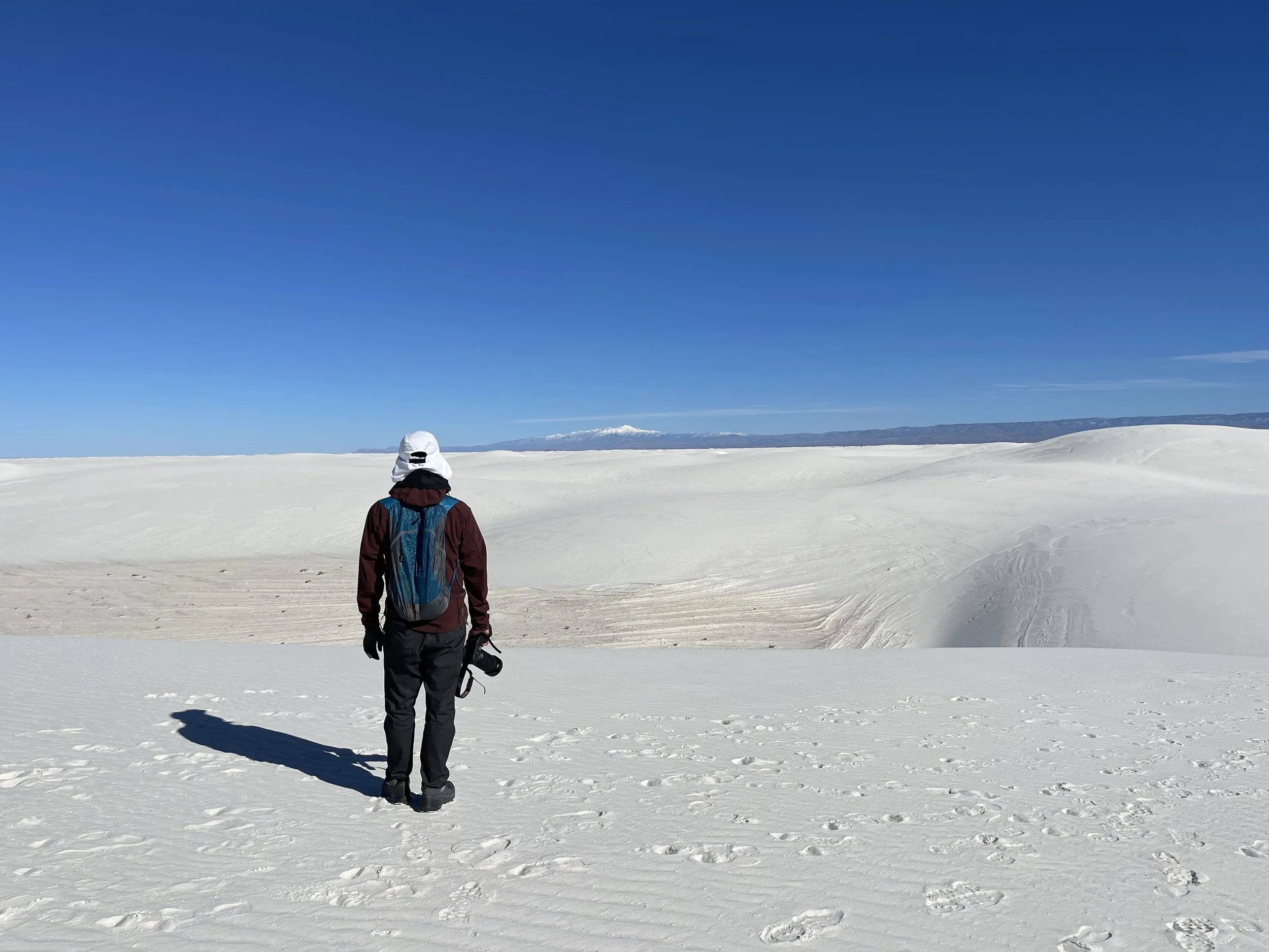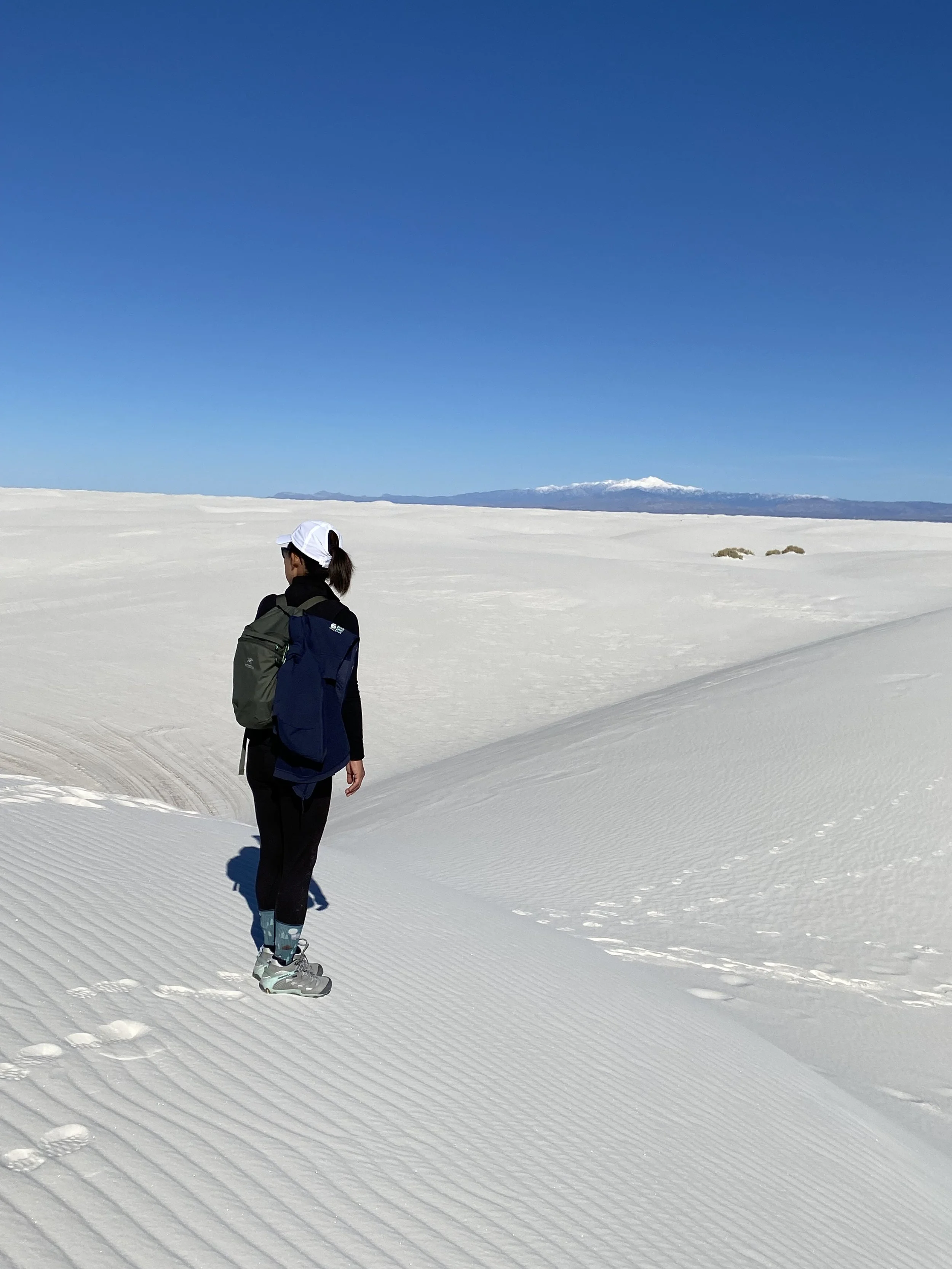 Then we drove into the park and gawked at the sight in front of us: miles and miles of white dunes, making the desert landscape suddenly look as if they were fields after the biggest snowstorm of the century, all impossibly white against the bluest skies. We felt a sense of cognitive dissonance because of the sensory contrasts: we felt chilly in the shade, but hot under the sun; we glimpsed brown and green mountains on the horizon but white dunes under our shoes; we saw many cars along the main road, while almost no one during our hikes. (Although the dunes look like snow in our pictures, they’re actually gypsum fields, deposited thousands of years ago during a process that began when this area was still underwater.)