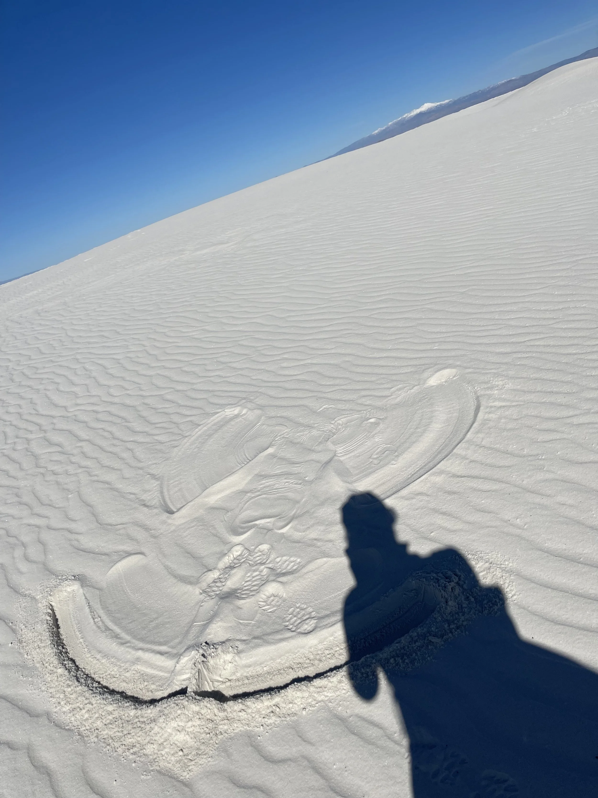 We went back to White Sands National Park today to hike the Alkali Flat Trail (loop, 5 miles), about which the Park Service app helpfully tells us, “This trail is not flat!” It’s basically going up and down sand dunes, but the effort is rewarded by absolutely phenomenal views of endless dunes and mountains, better than even those in the Backcountry Campground Loop. As a special bonus today, the Sacramento Mountains were capped with snow.