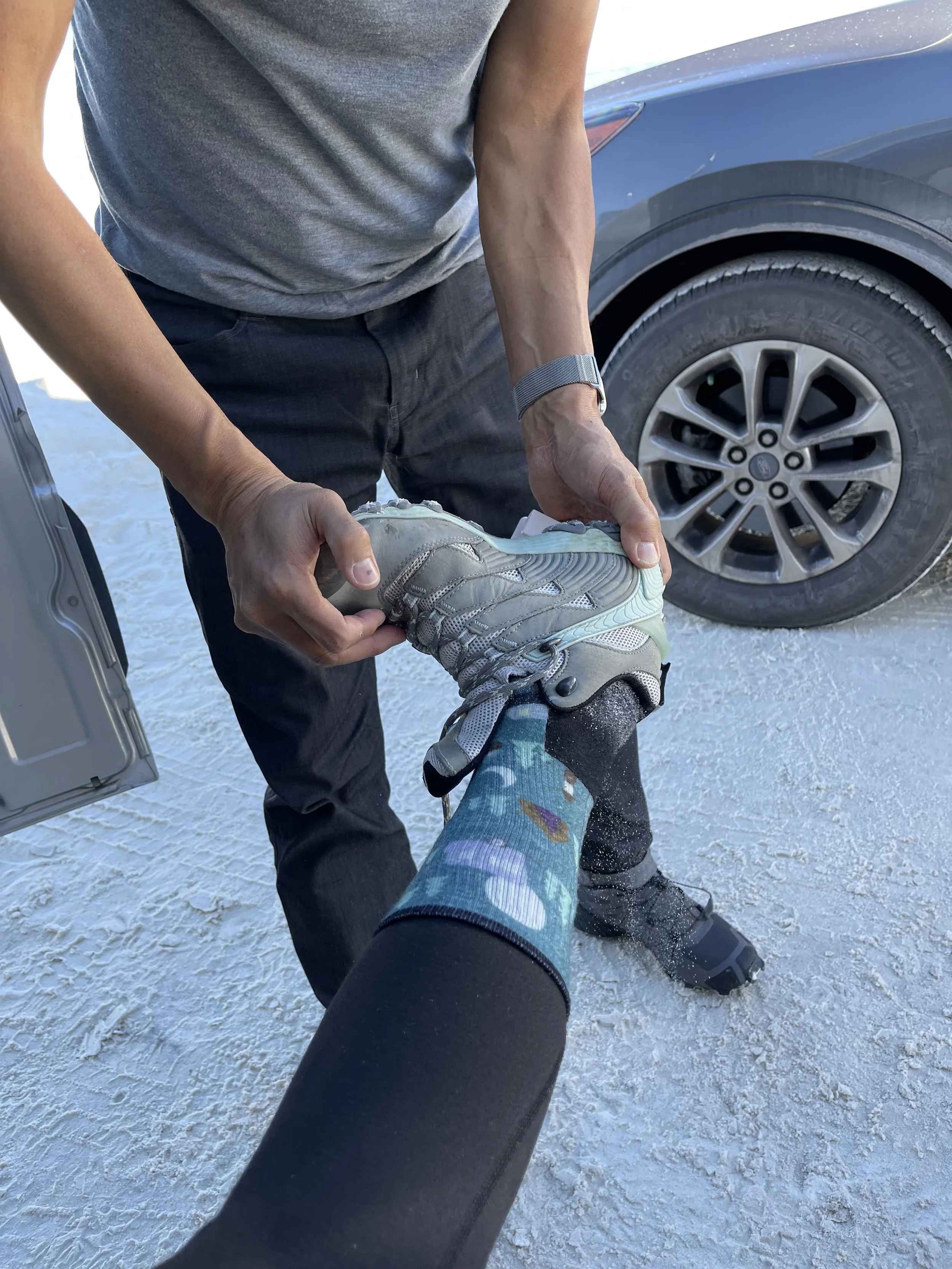 Hiking on gypsum is pretty much like hiking on sand: depending on how dry the gypsum is, your shoes sink into the trail — sometimes up to your calf when going uphill — and you have to work hard to extract them each time you want to take another step. Wash-rinse-repeat. The novelty of the landscape distracted us from the fact that it was a pretty serious cardio workout.